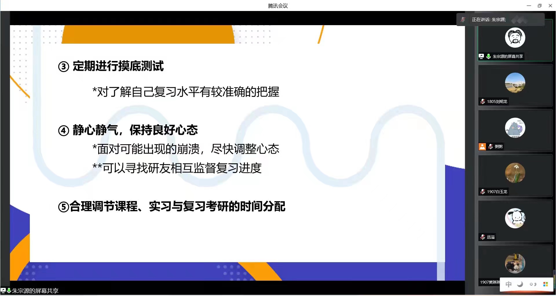 吴世琦、朱澄、朱宗源、郭世豪、刘明龙就自己的考研过程、支教保研经历进行了分享。几位准研究生提醒,在备考中,要合理分配时间,要针对考试科目复习的重点、难点查漏补缺,紧抓基础,不断提高思维能力、学习效率,及时总结;在择校、专硕或学硕选择方面,叮嘱同学们不要盲目从众,要根据报考公司的实际情况来选择;在复习时,英语要注意提高词汇的储备量,政治要关注时事,扎实听课,通过练习来巩固所学内容。