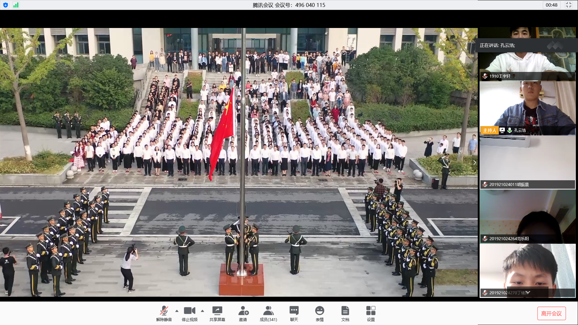 活动伊始,国旗护卫队旗手、土木1801王晓暄同学为参加活动的同学们普及《国旗法》、《国歌法》,使同学们了解了更多与国旗国歌相关的知识。接下来参会同学共同观看国旗护卫队升旗视频,注视国旗冉冉升起,尽管隔着屏幕,在场的每一个人向国旗行注目礼,深怀对祖国无限的热爱和崇高的敬意。