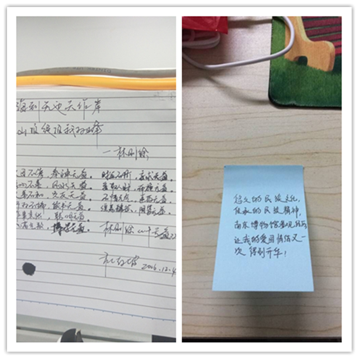 12月3日,两个支部的所有成员到达南京博物院后,分成家风、民风、党风、国风四部分浏览,领悟古代先贤修身齐家的家国情怀;12月5日,支部组织欣赏作品《林则徐的家风》、《陆游的家风》、《郑义门》等,学习历史名人恪守传承的人生境界;学习结束后支部组织党员进行学习讨论,每位党员写一句有关“家风、民风、党风、国风”的宣传语或警戒语,放置在自己的学习桌上,时刻提醒自己静以修身,俭以养德。