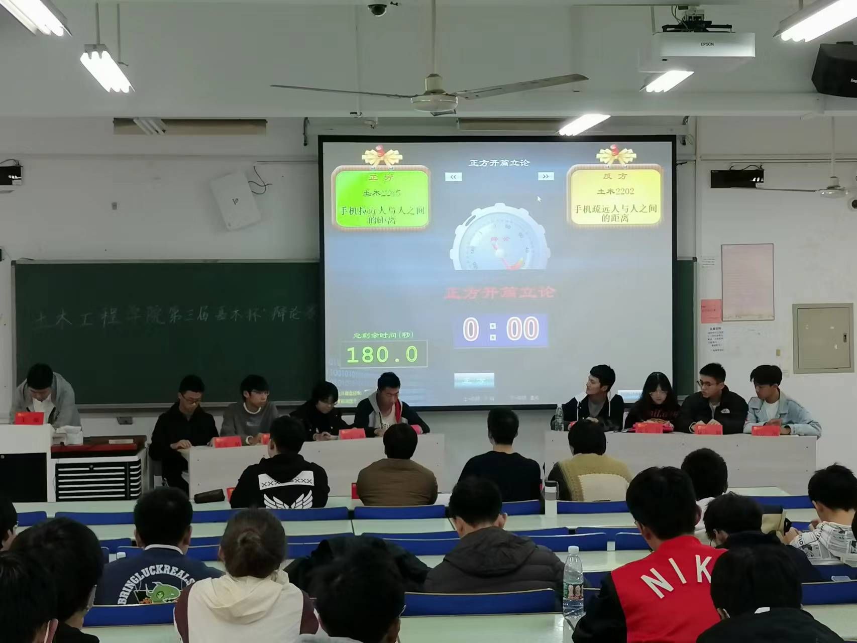 本次决赛的辩论主题为:手机拉进/疏远了人与人之间的距离。正方为土木类2205班辩论队,反方为土木类2202班辩论队。