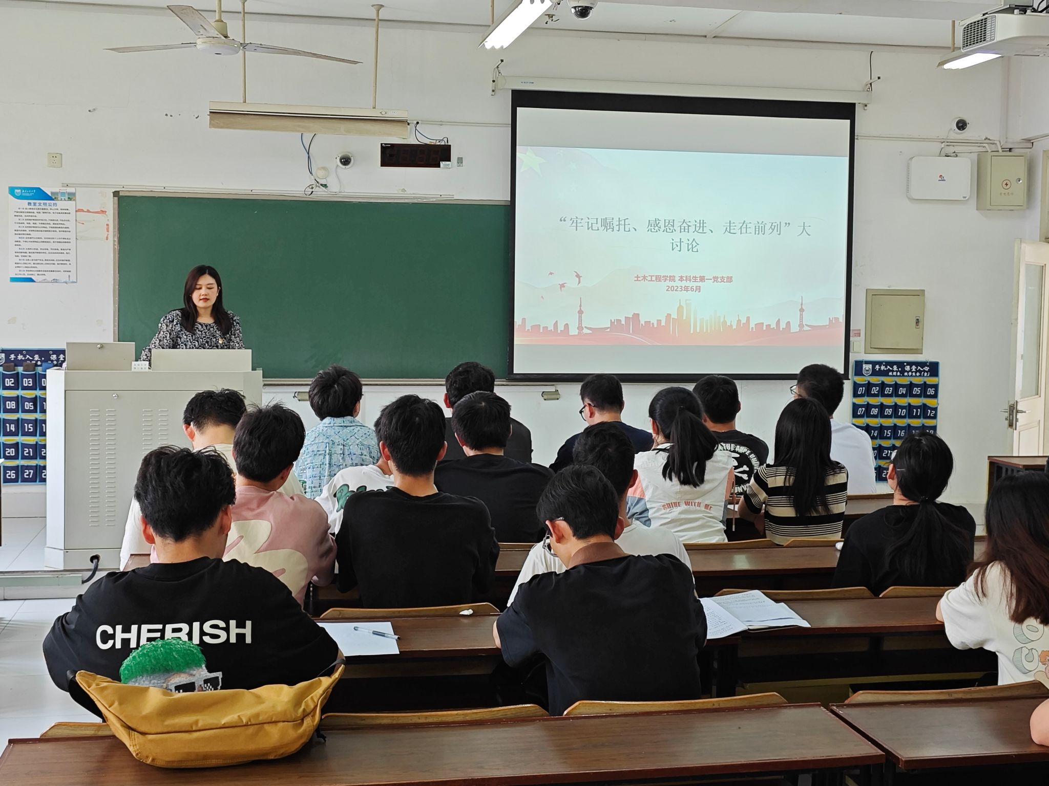 为深入学习贯彻习近平新时代中国特色社会主义思想,全面贯彻落实党的二十大精神,根据公司、公司党委《关于开展“牢记嘱托、感恩奋进、走在前列”大讨论的通知》要求,太阳集团tyc33455官网本一党支部于6月7日下午在仁智楼328教室开展“牢记嘱托、感恩奋进、走在前列”大讨论,会议由支部书记谢璐璐老师主持。