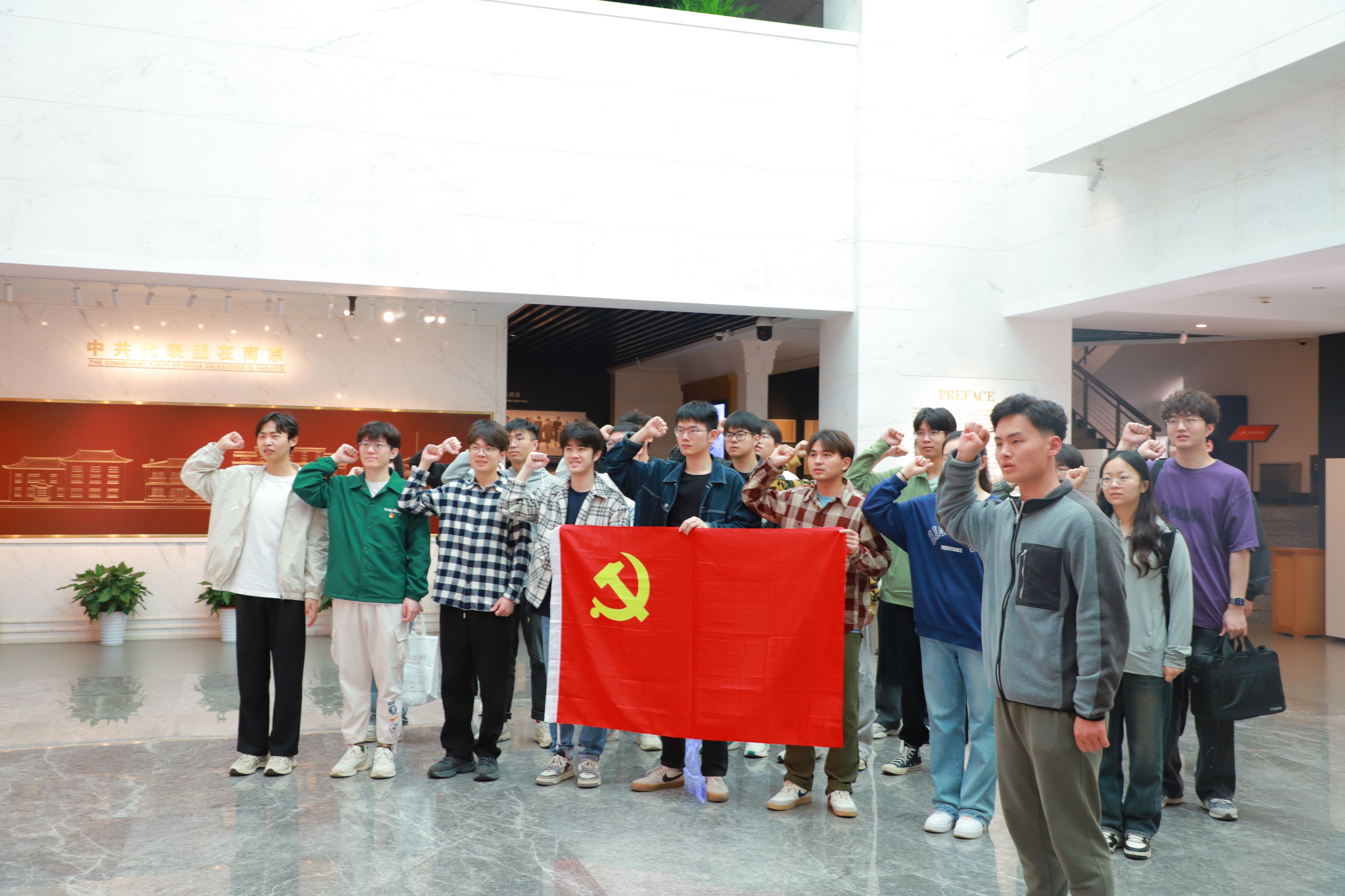 最后,支部党员回到国共南京谈判史料馆中央大厅,面向党旗,举起右拳,重温入党誓词。