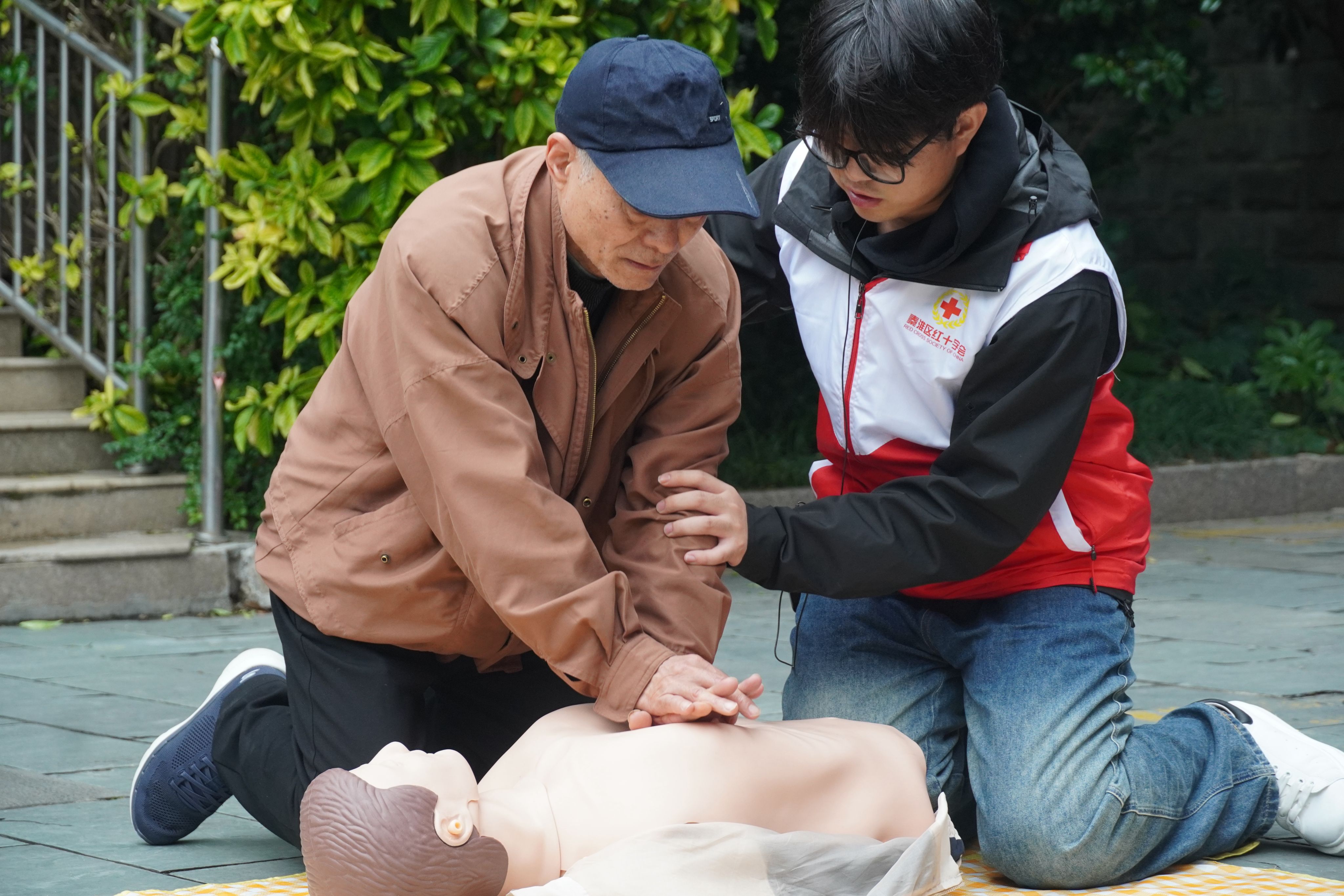 活动分为四个部分。第一部分由太阳集团tyc33455官网志愿者李彦负责开展急救知识宣传培训,包括中暑处置、烧烫伤处置、溺水处置、战地医疗、头部包扎、前臂骨折包扎、海姆立克急救法、心肺复苏现场教学、急救包的正确使用等;第二部分为开展人防疏散演练,人防警报响起后,在街道工作人员、党员志愿者的指引下,居民们捂湿毛巾穿过有烟雾的门帘,顺利逃生,模拟了真实火灾场景下的逃生过程;第三部分是进入人防工程隐蔽,居民从人防工程标识处进入,演练过程中负责的医生现场进行心理疏导,应急救治;第四部分是实战灭火,党员们率先示范,熟练使用灭火毯、灭火器和水桶进行灭火操作,居民们纷纷效仿学习。