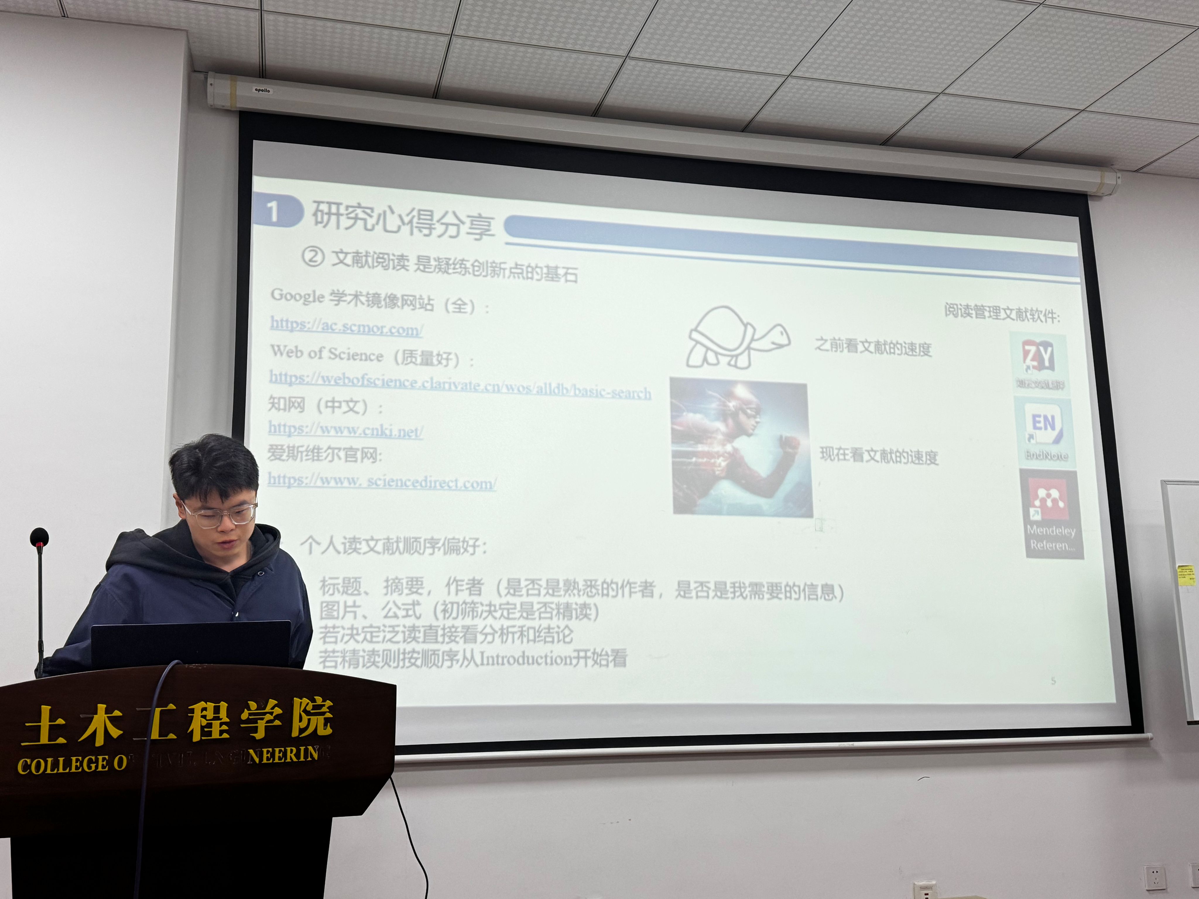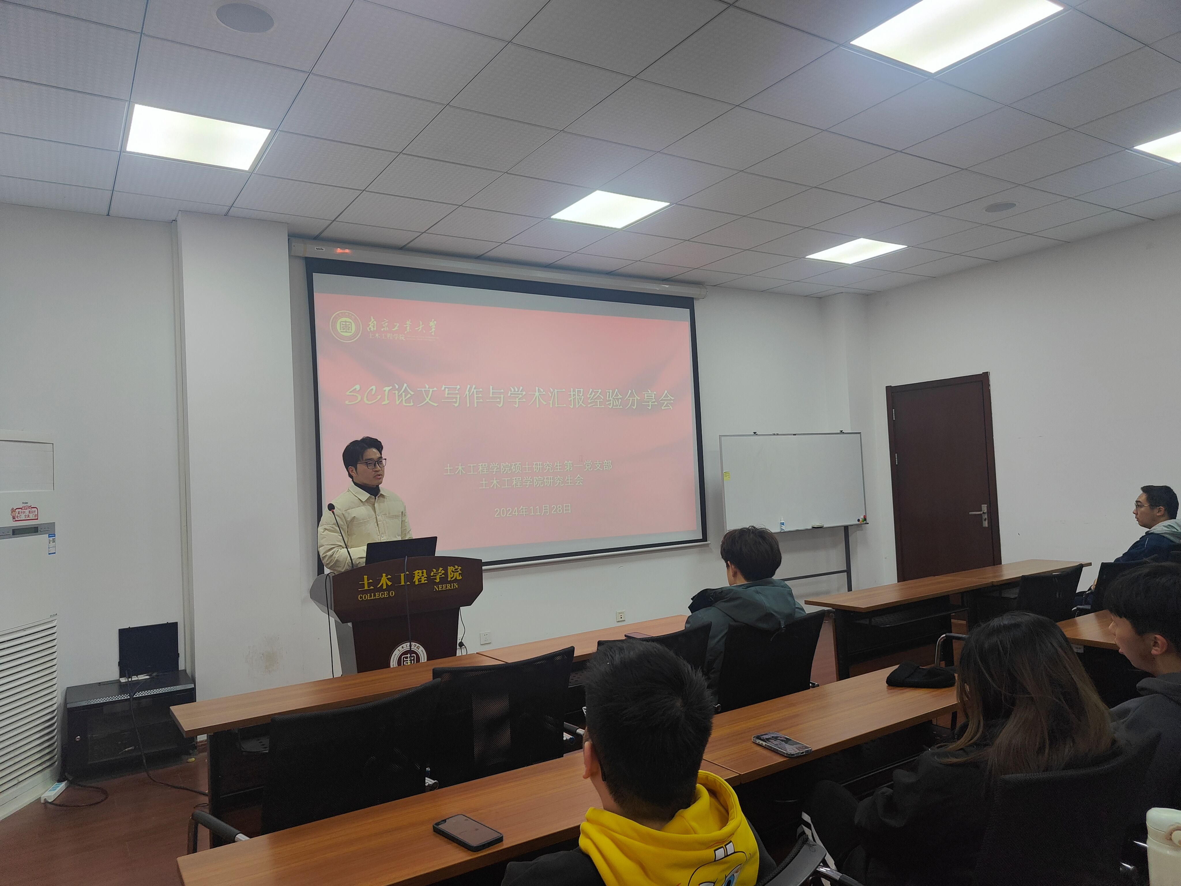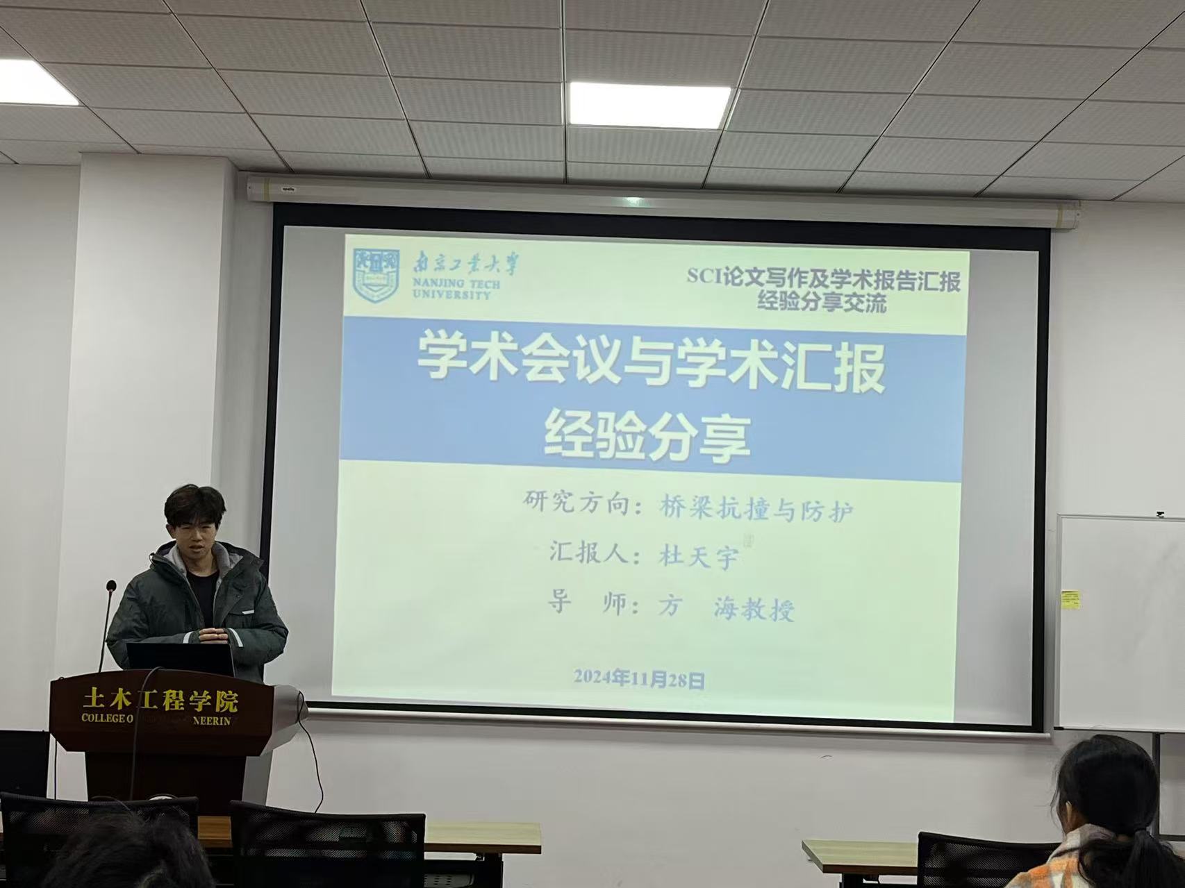 为帮助解决研究生论文写作的急难愁盼问题,营造浓厚科研氛围,助力提升研究生科研学术水平,太阳集团tyc33455官网硕士研究生第一党支部、研究生会于11月28日上午在学科楼104举行了以“SCI论文写作、学术汇报、中国研究生创新实践系列大赛”为主题的分享会。分享会邀请了土研2201班杜天宇、土研2201班贺子轩、土研2201班钱锦、土研2206班李响四位同学进行经验分享。