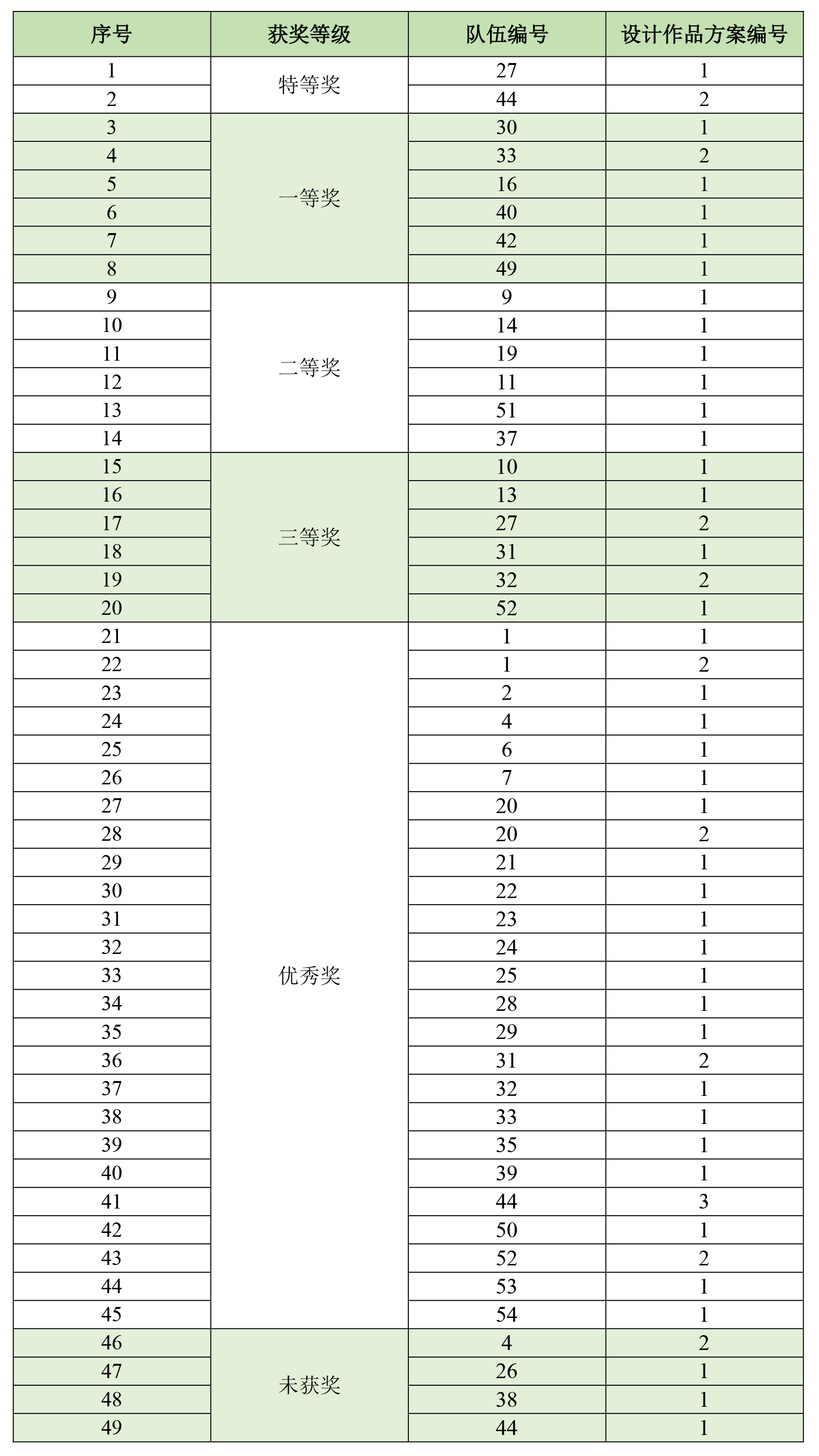 3月20日和5月16日分别举行了初赛和决赛,对参赛队伍提交的49件创新设计作品进行了评审。共评选出特等奖作品2件、一等奖作品6件、二等奖作品6件、三等奖作品6件、优秀奖作品25件,另有4件不满足赛题要求的创新设计作品。现将获奖与评审结果公布如下。