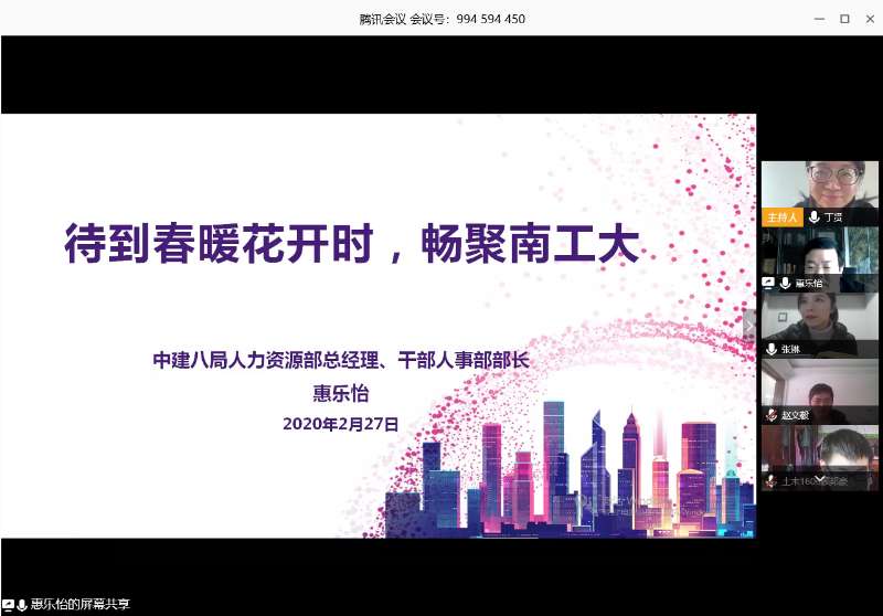 为进一步做好疫情防控期间的毕业生就业工作,2月27日下午,太阳集团tyc33455官网举办了网络就业指导讲座,中建八局人力资源部总经理、干部人事部部长惠乐怡应邀担任主讲。党委学工部副部长张涛、公司党委副书记丁贤、毕业班辅导员和250余名毕业生参加了讲座,讲座由丁贤主持。
