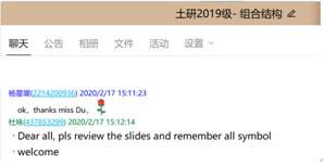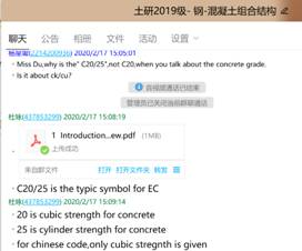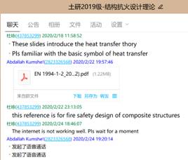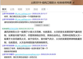在研究生授课方面,公司及时组织专业课程的授课教师做好本学期研究生课程的线上教学工作,目前本学期全部专业课程在线教学准备工作已完成。公司杜咏教授本学期承担了土研2019级英文授课课程《结防抗火设计理论》和《组合结构》。杜老师提前搭建了在线授课平台,通过分屏语音系统,用在线群研讨、留言的方式与同学们互动交流,来自全国各地乃至身在国外的职工,通过任课老师发布的屏幕分享平台聚集在一起。研究生们感受到了公司及老师们的牵挂,虽然“宅家”,但距离却仿佛更近了,网课上的同学到课准时,且比课堂教学互动更为踊跃,授课结束时,纷纷给老师点赞;课后,老师及时分享课件资料,勤学好问的同学还积极与老师在线沟通。在线授课质量达到了既定教学效果。