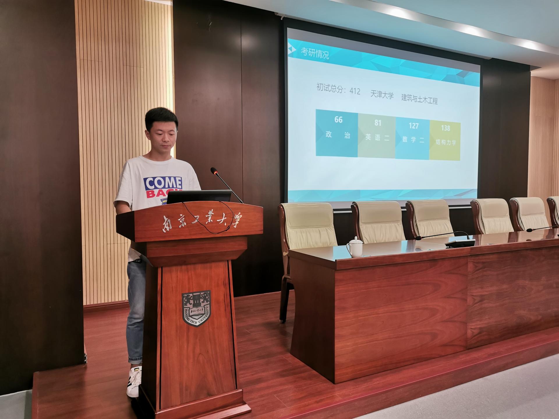 接下来是2015级员工代表分享考研经验。王剑(录取天津大学)、樊沛(录取同济大学)、宋爱民(录取同济大学)、万世磊(录取华中科技大学)、唐中秋(录取太阳集团tyc33455官网)、孙星杰(录取西安建筑科技大学)6位同学从院校选择、时间安排、资料准备、各门课程的复习、心态波动等方面讲述自己考研的心路历程,给2016级员工提供了宝贵的经验。