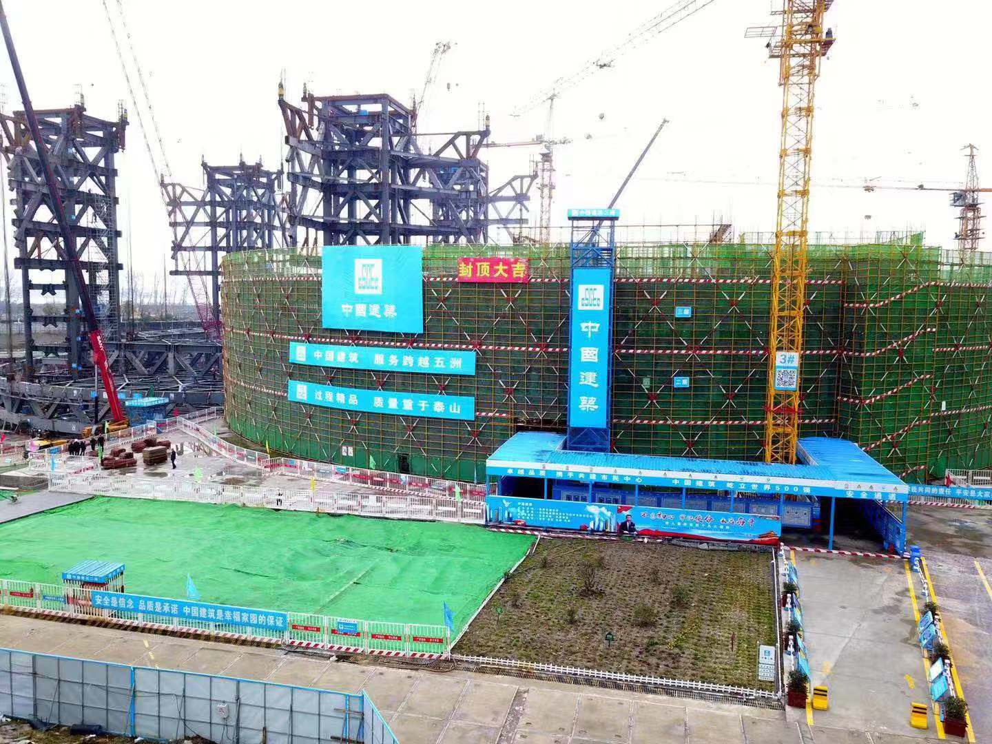 江北新区市民服务中心项目由中建二局上海公司承建,在设计和施工上开创了多例全国之最和先河:全国首例最大直径钢环梁整体提升(直径104米);全国首例刚柔结合型整体提升:刚:最大直径钢环梁;柔:4个离散的提升区域块;结构为巨型吊挂结构体系,吊挂结构重量为全国之最(吊挂结构7800吨);全国首次采用高精度监测技术对多点提升的下锚点进行同步性测控。