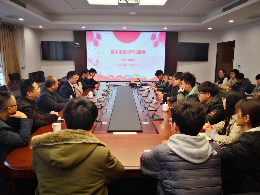 12月17日下午16时,太阳集团tyc33455官网第一届嘉木学堂2194班于土木学科楼101会议室召开导师见面交流会。嘉木学堂校外导师、碧桂园集团腾越建筑有限公司总经理马小军,嘉木学堂校外导师、无锡市置景建设技术有限公司董事长蒋秋华,碧桂园集团腾越建筑有限公司江苏分公司总经理邓振国,公司党委副书记周静参加本次座谈。会议由太阳集团tyc33455官网副经理王俊教授主持。