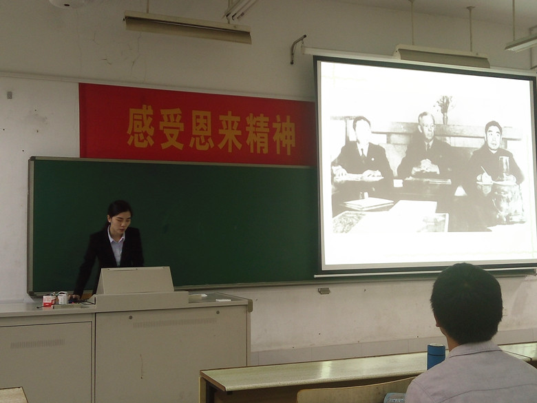接着,吴老师通过ppt,从三个方面图文并茂地上了一堂生动的党课。第一,给同学展示了梅园新村的一些标志性建筑、革命旧址,每个建筑都有一些有关周总理的小故事,而这每个故事都在诠释着恩来精神----积极进取、艰苦奋斗、求真务实、勇于创新、严于律己、甘为公仆。第二,绘声绘色地给同学们再现了当年国共南京谈判的历史画面,让同学们更为深入细致的了解了当时发生的历史事件及事件前后的因果关系等,从而加深了对当时国情的理解,激发了他们对如今美好生活的珍惜之情。第三,通过一段段相关人物采访视频,由革命老前辈们口中,她让同学们更全面地了解当时周恩来学习、工作及生活的各个方面,立体的感受到了周恩来的人格魅力。