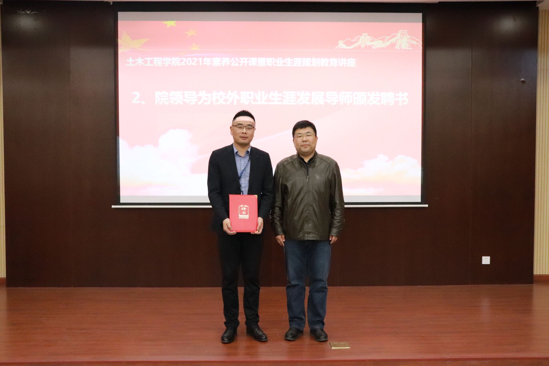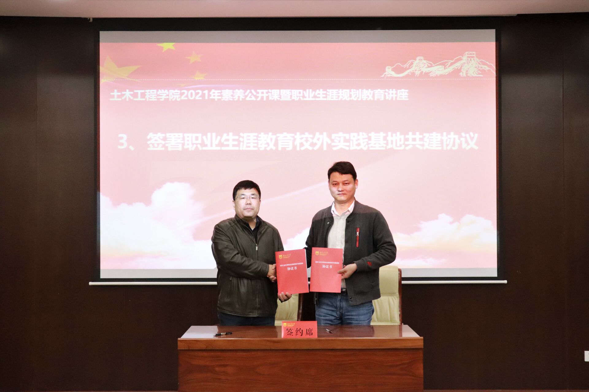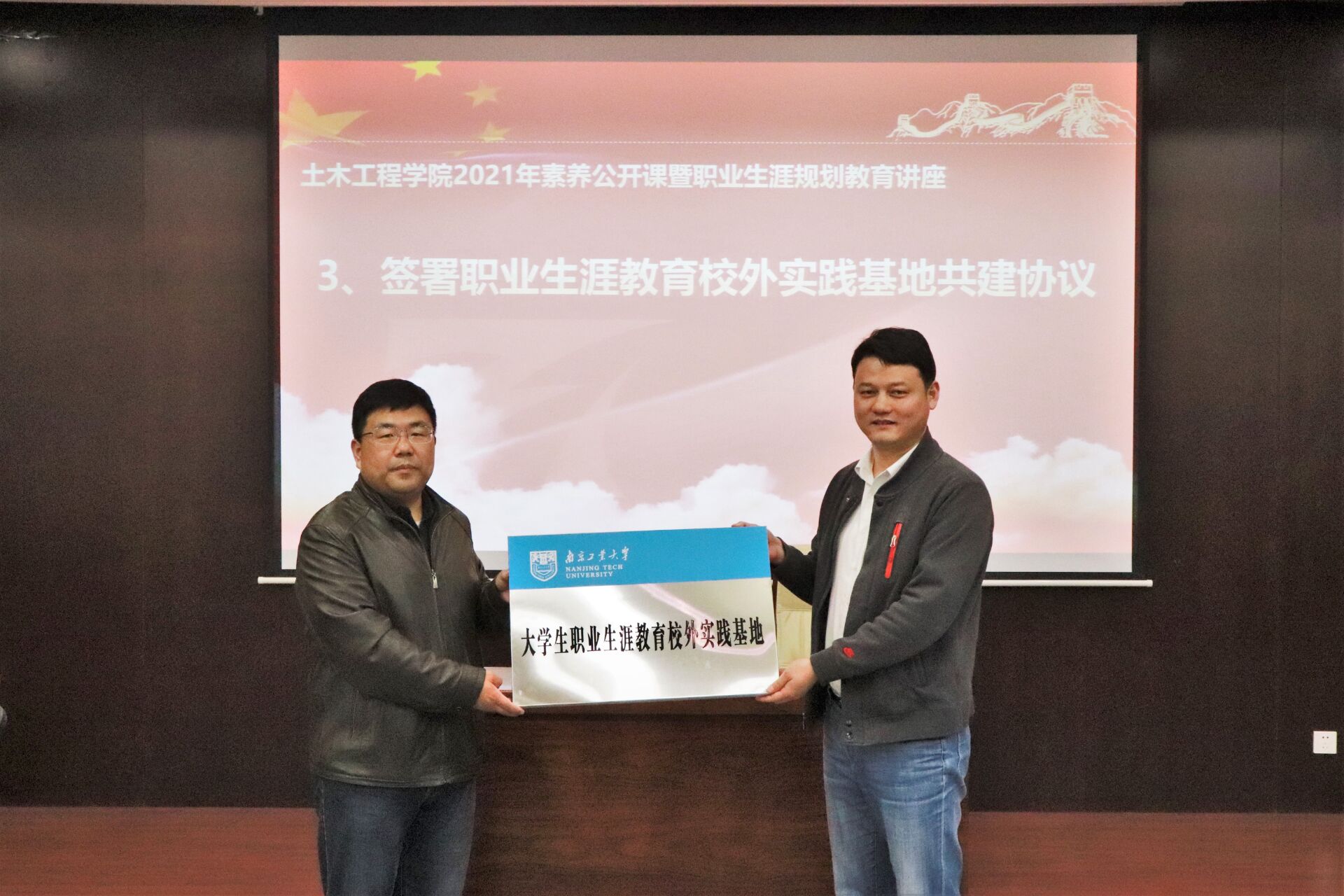 在热烈的掌声中,公司党委书记张涛为李盛经理颁发校外职业生涯规划导师聘书,与上海宝冶南京分公司庄道春部长共同签署职业生涯教育校外实践基地共建协议并授牌。