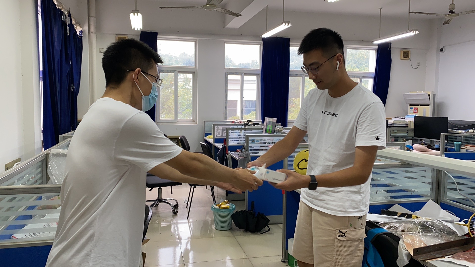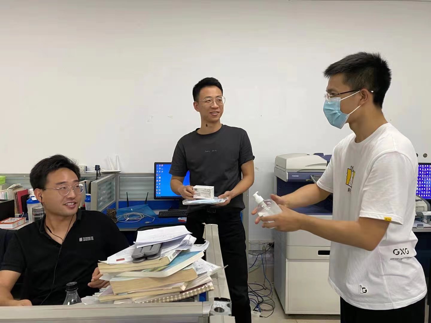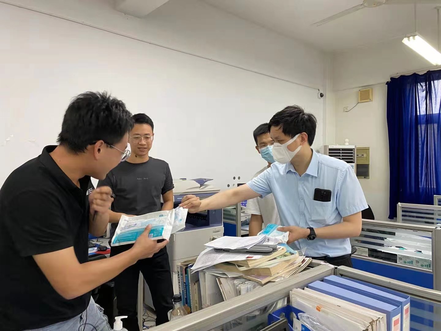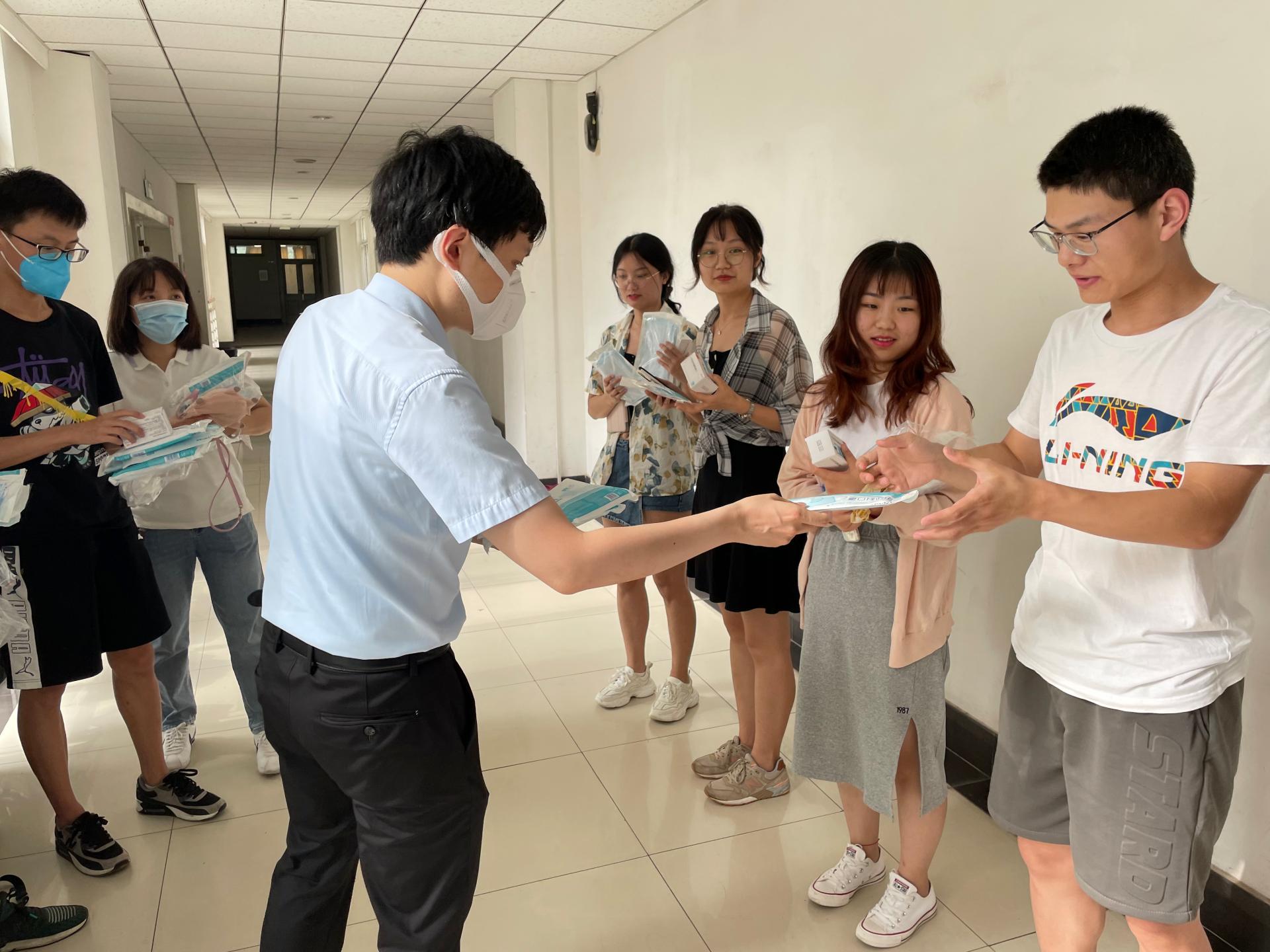 为全面了解暑期留校员工的学习生活情况,保障员工考研复习、科研工作、学科竞赛等工作有序开展,近日,公司党委副书记路遥,毕业班辅导员狄远帆、游艺林,研究生辅导员李涛到同和楼考研自习教室和地坤楼研究生工作室看望慰问留校员工,并代表公司为留校员工送上医用外科口罩、酒精消毒片、免洗消毒凝胶等防疫物资。