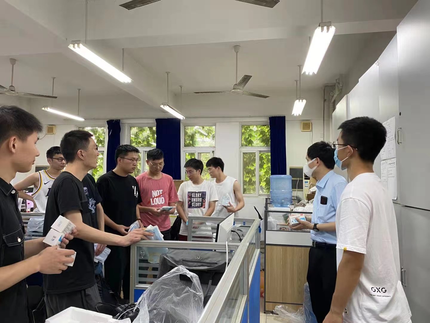 在地坤楼研究生工作室,老师们实地查看了工作室的环境卫生及消毒工具配备情况并询问了留校研究生的科研工作进展。路副书记叮嘱研究生,工作室作为研究生学习、科研的公共空间,人员相对集中固定,要切实加强工作室环境卫生建设,做到疫情防控和科研工作两不误。同学们对公司关心和慰问表示感谢,并承诺遵守疫情防控有关要求,充分利用暑期留校时间进行学习、开展研究。