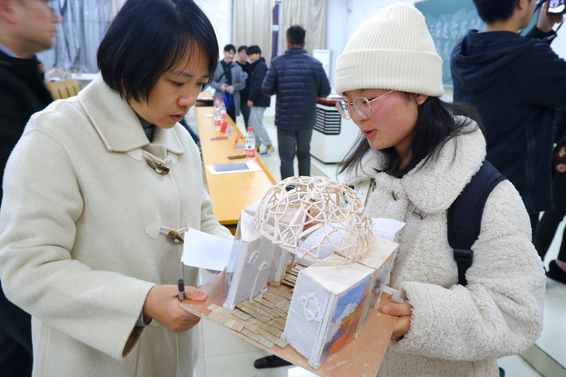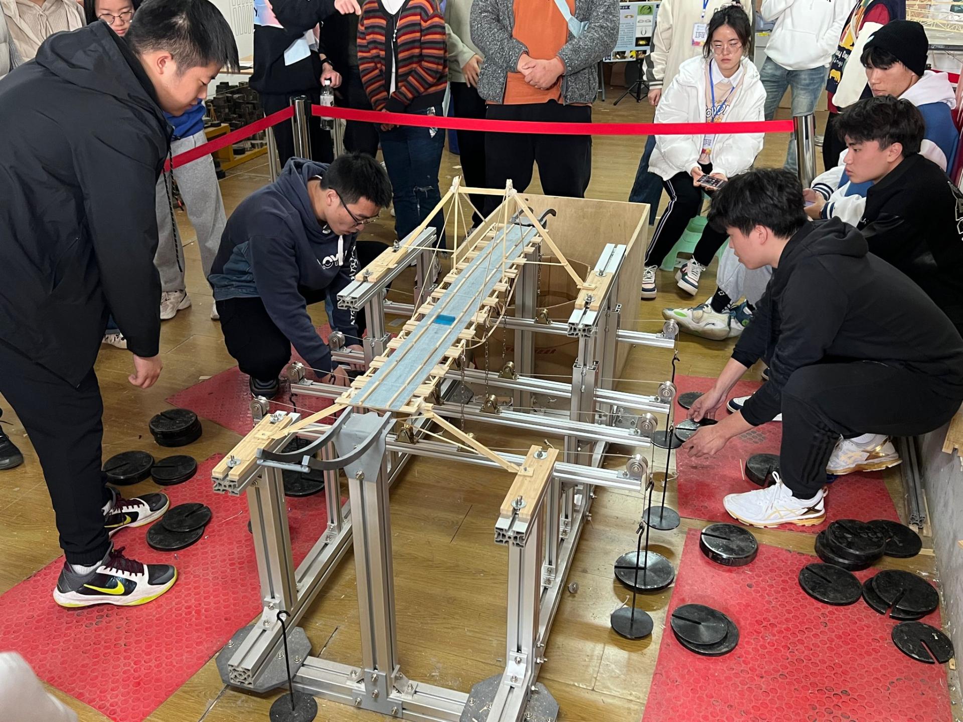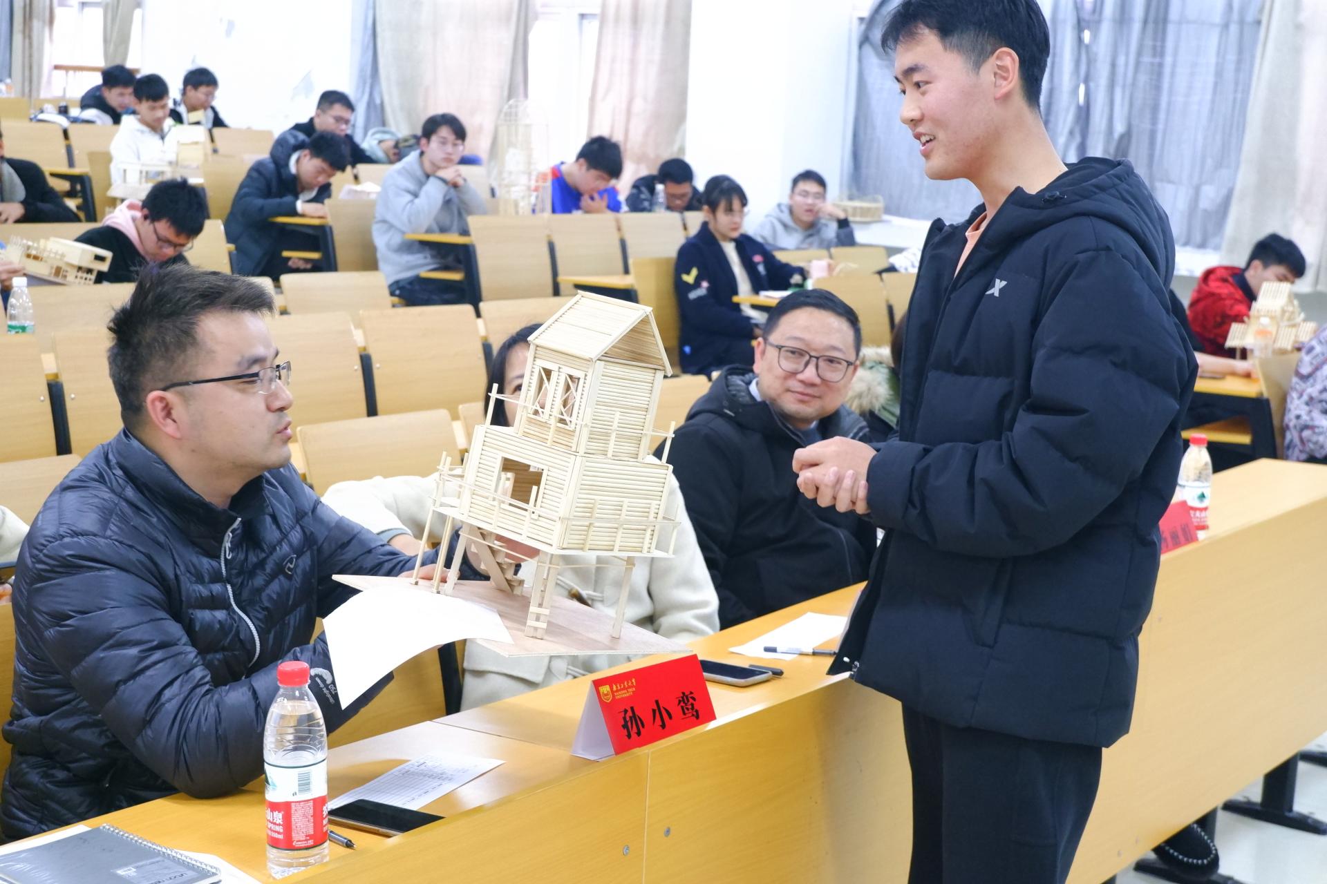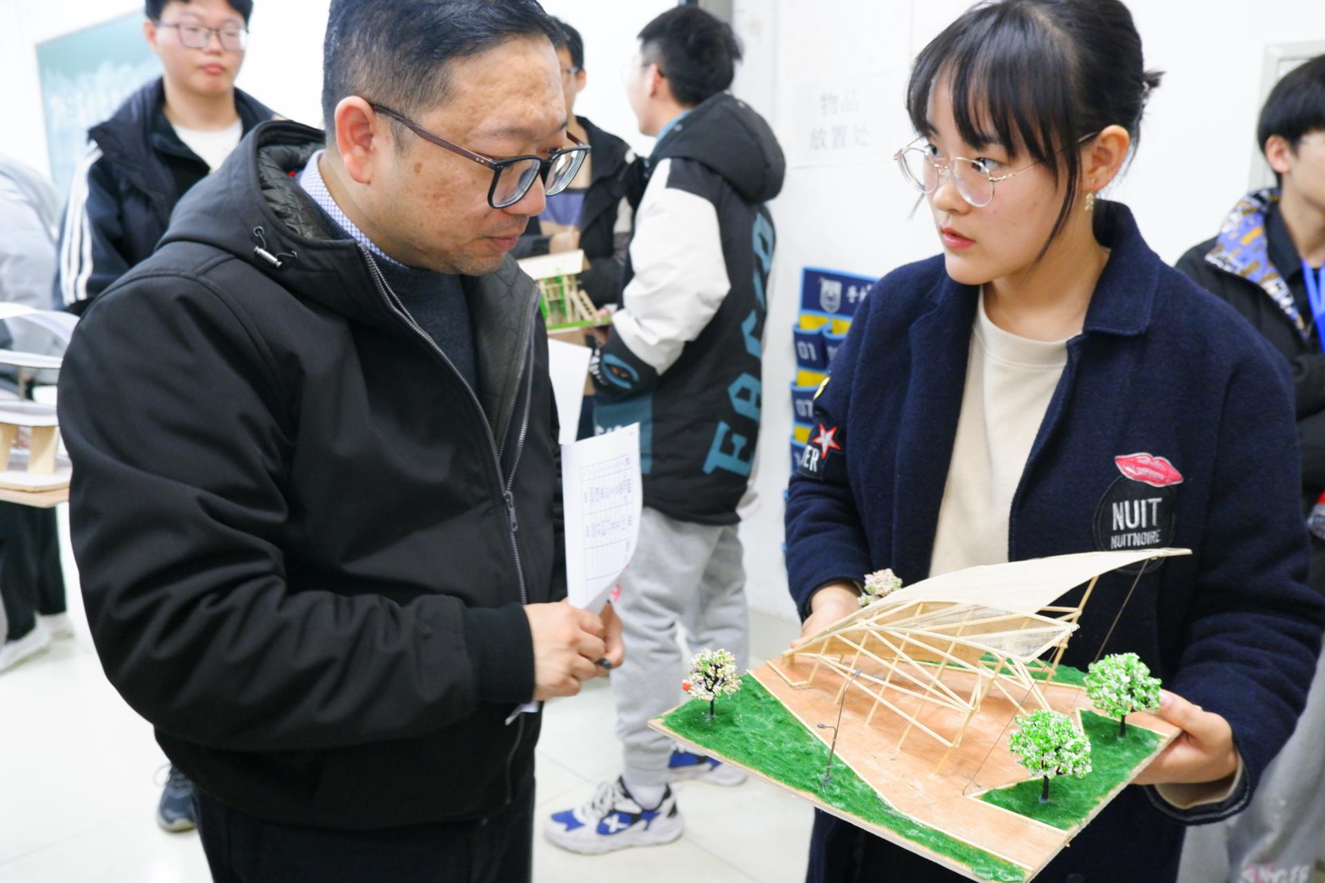 在加载组决赛中,44组参赛选手在2个星期时间里把理论付诸实践,令想象化为现实,经过8小时紧张激烈的加载,他们以卓越的思维力和默契的团队合作能力创造了一个个精妙绝伦的“微缩桥梁”,真正实现了“学以致用,最终17组团队脱颖而出,其中陈星宏和周涌昊同学负责的两组以轻便的重量和独特的结构从众多佼佼者中脱颖而出获得一等奖。本次赛题设计除对桥梁尺寸与材料作要求外,不做其他限制,以求充分激发选手的创新活力。斜拉结构的灵活运用,鱼腹梁结构的巧妙结合,锥形桥体的大胆创新,无不体现选手的匠心精神。在模型展示组决赛现场,39个参赛作品各有千秋,从具备古典美的木屋,到具有现代感的体育场;从充满人文气息的竞技场,到充斥着幽静感的林间屋舍——竹条交错搭建出的不只是作品,还是参赛队员们汗水与心血的凝练。最终,王苏豫小组以他们构思精妙,大胆创新的作品赢得老师们的一致认可,脱颖而出,获得展示组一等奖的成绩。评委老师对参赛作品进行了专业点评,鼓励员工持续改进,不断取得进步。