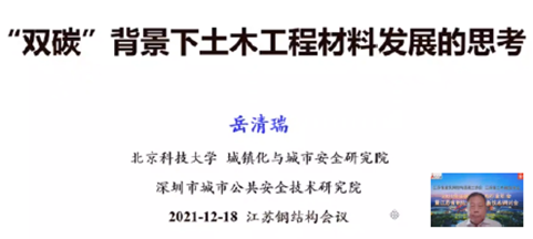 简短的开幕式后刘加平院士主持了第一阶段的专家报告,岳清瑞院士做了题为“‘双碳’背景下土木工程材料发展的思考”的报告,阐述了他对土木工程材料减碳的深刻思考,包括三个方面:一是土木工程材料碳排放;二是减少土木工程材料碳排放的路径;三是土木工程材料发展的挑战。岳院士报告结束后,刘加平院士点评岳院士的报告突出了新理念和新思路,具有战略高度和引领性。