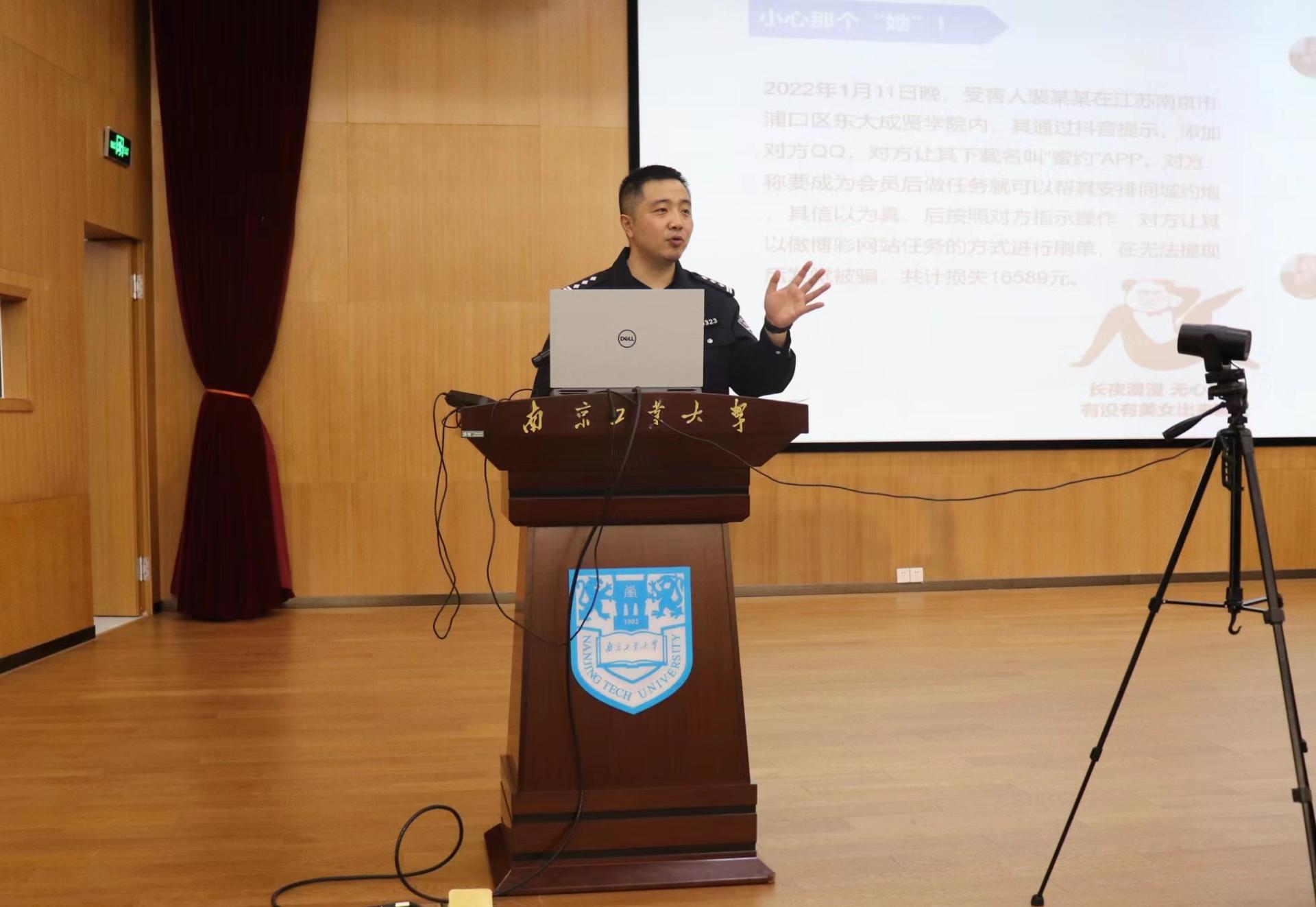 为进一步提高公司员工防诈反诈意识,进一步提升反诈宣传员业务技能,3月16日下午,由保卫处主办、太阳集团tyc33455官网承办的“防范电信网络诈骗”安全教育专题讲座在笃学楼报告厅开展。江北新区公安分局刑警支队政委、南京市侦查标兵、江苏省百佳刑警马科同志担任主讲人。本次讲座采用线上下结合的方式,公司本科生、研究生反诈宣传员、员工代表等近40人现场参加,其他员工线上同步观看。讲座由保卫处副处长徐东主持,公司党委副书记路遥、员工工作办公室主任黄乐等参加活动。