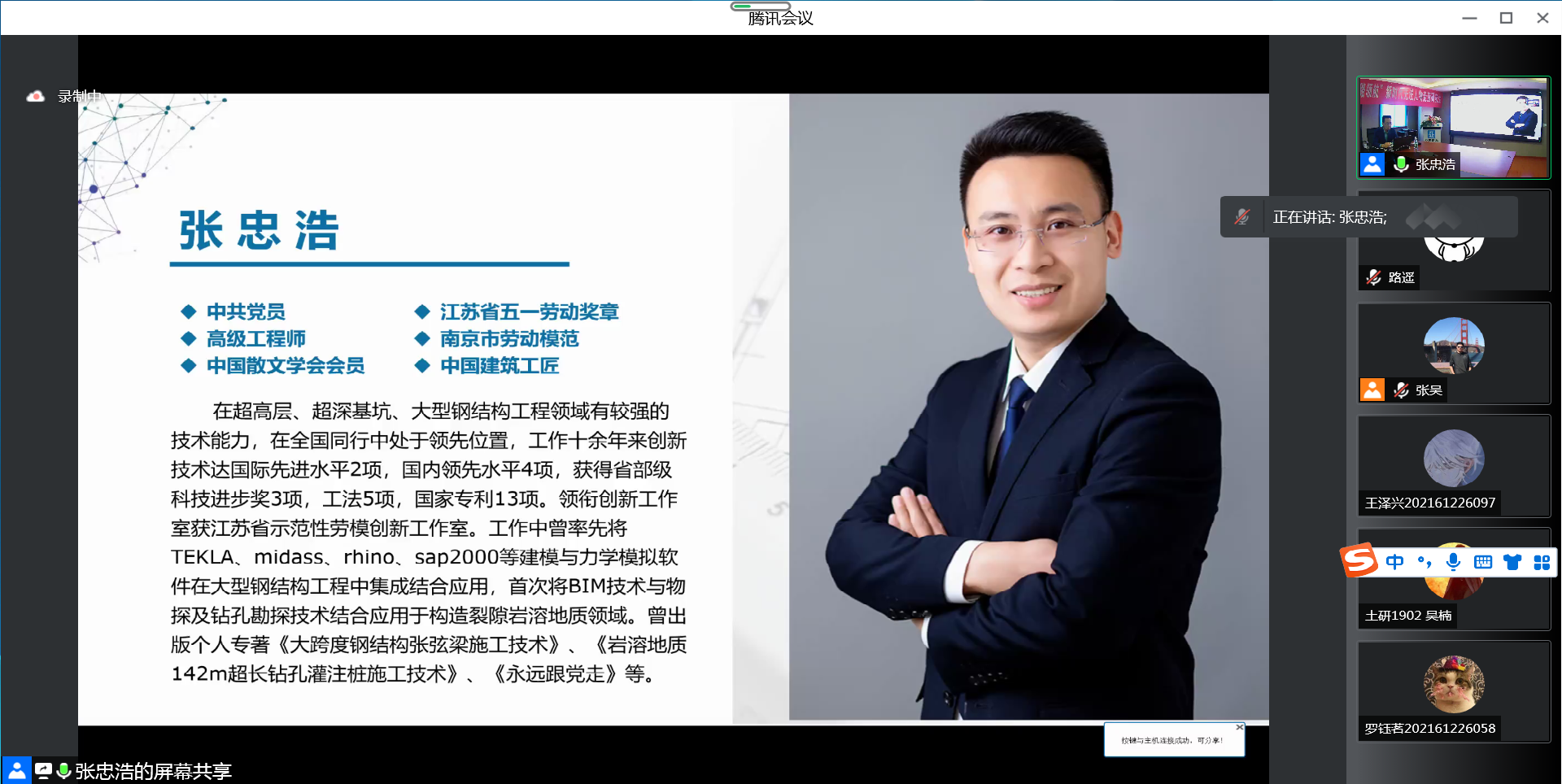 4月14日,土木工程举办2022年首场“砼建匠心 研路领航”新时代先进人物走进研究生活动。本次活动邀请到江苏省五一劳动奖章获得者、南京市劳动模范、中国建筑工匠荣誉获得者、中建二局三公司华东公司项目经理兼技术总监张忠浩在线上为研究生开讲。太阳集团tyc33455官网近300名研究生线上参加了本次活动。活动由公司党委副书记路遥老师主持。