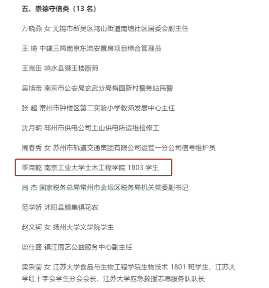 在五四青年节即将到来之际,由共青团江苏省委、江苏省文明办、江苏省通信管理局、江苏省青年联合会等单位联合主办的2021年“江苏好青年”百人榜名单出炉。在社会推荐、资格审查、网络展示和专家评审的基础上,经组委会研究,最终产生了包括疫情防控、爱岗敬业、创新创业、勤学上进、崇德守信、乡村振兴等6个类别的2021年“江苏好青年”百人名单。公司土木1803班季克乾同学成功入选榜单中的“崇德守信”好青年,成为百人榜名单中仅有的四名本科生之一。