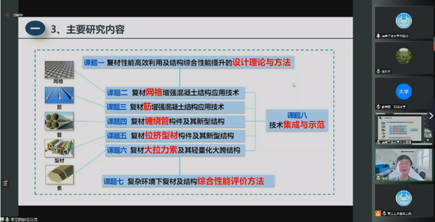 美国国家科学基金会基础设施领域复合材料协同创新中心主任、西弗吉尼亚大学Hota GangaRao教授和该中心执行主任梁瑞凤教授在线致辞并作报告