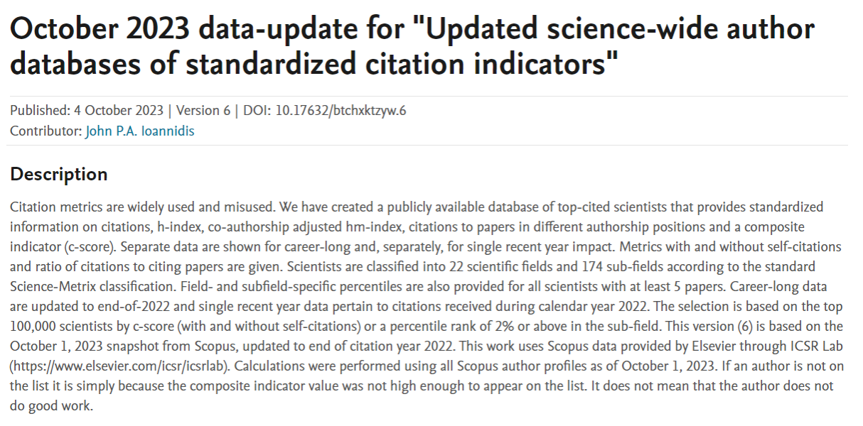 该榜单以Scopus数据库为依据,基于引用次数、H因子、HM因子等综合指标,根据其“生涯影响力”和“年度影响力”从近700 万名科学家中遴选出世界排名前2%的科学家,分为22个领域和174个细分子领域。为科学家长期科研表现提供了一个衡量指标,能够更客观、更真实地反映科学家的影响力。