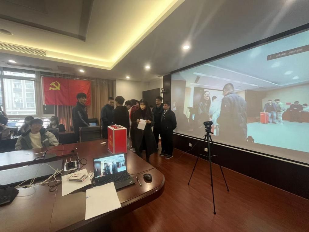 在计票过程中全体师生党员集中观看党风廉政教育专题片。