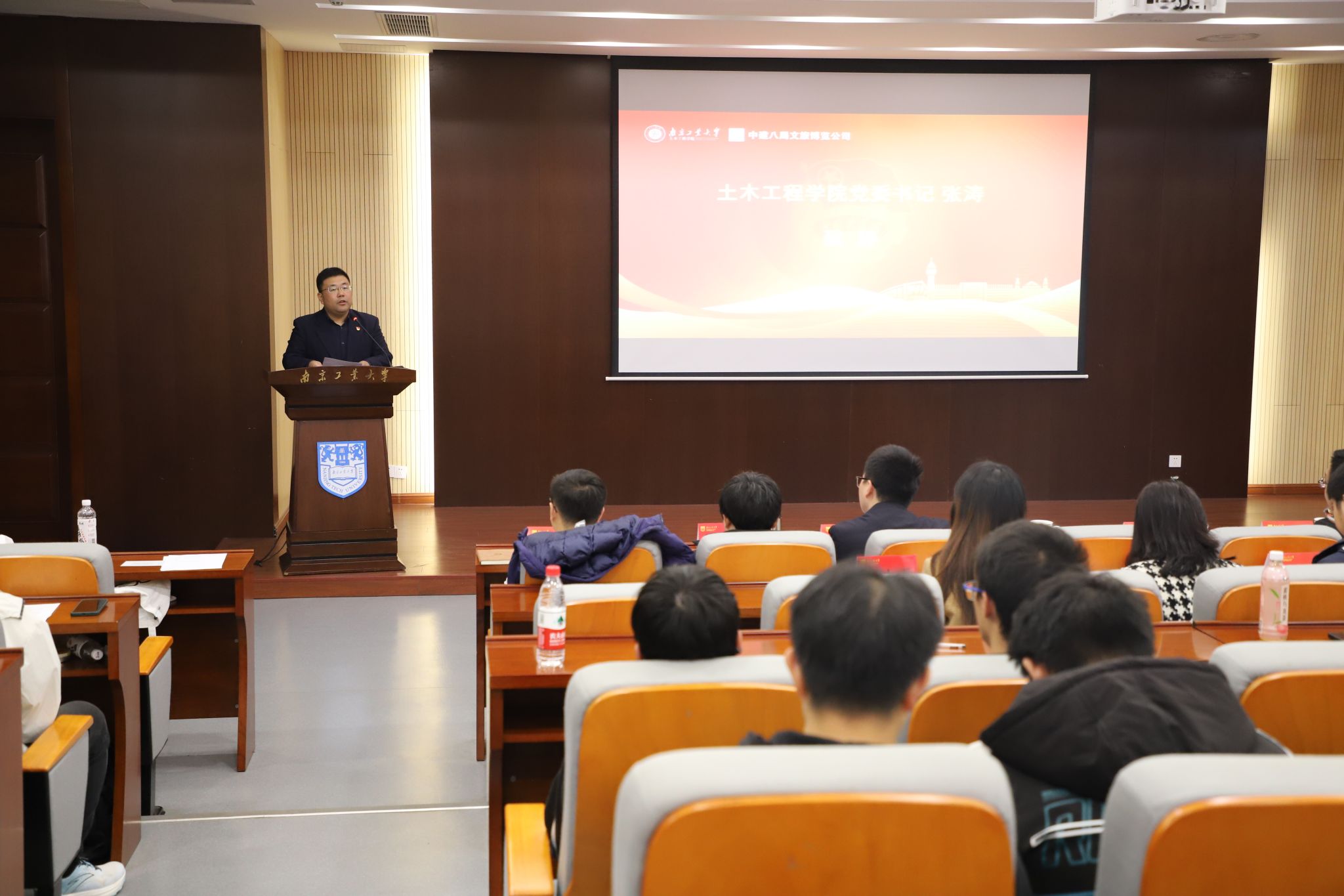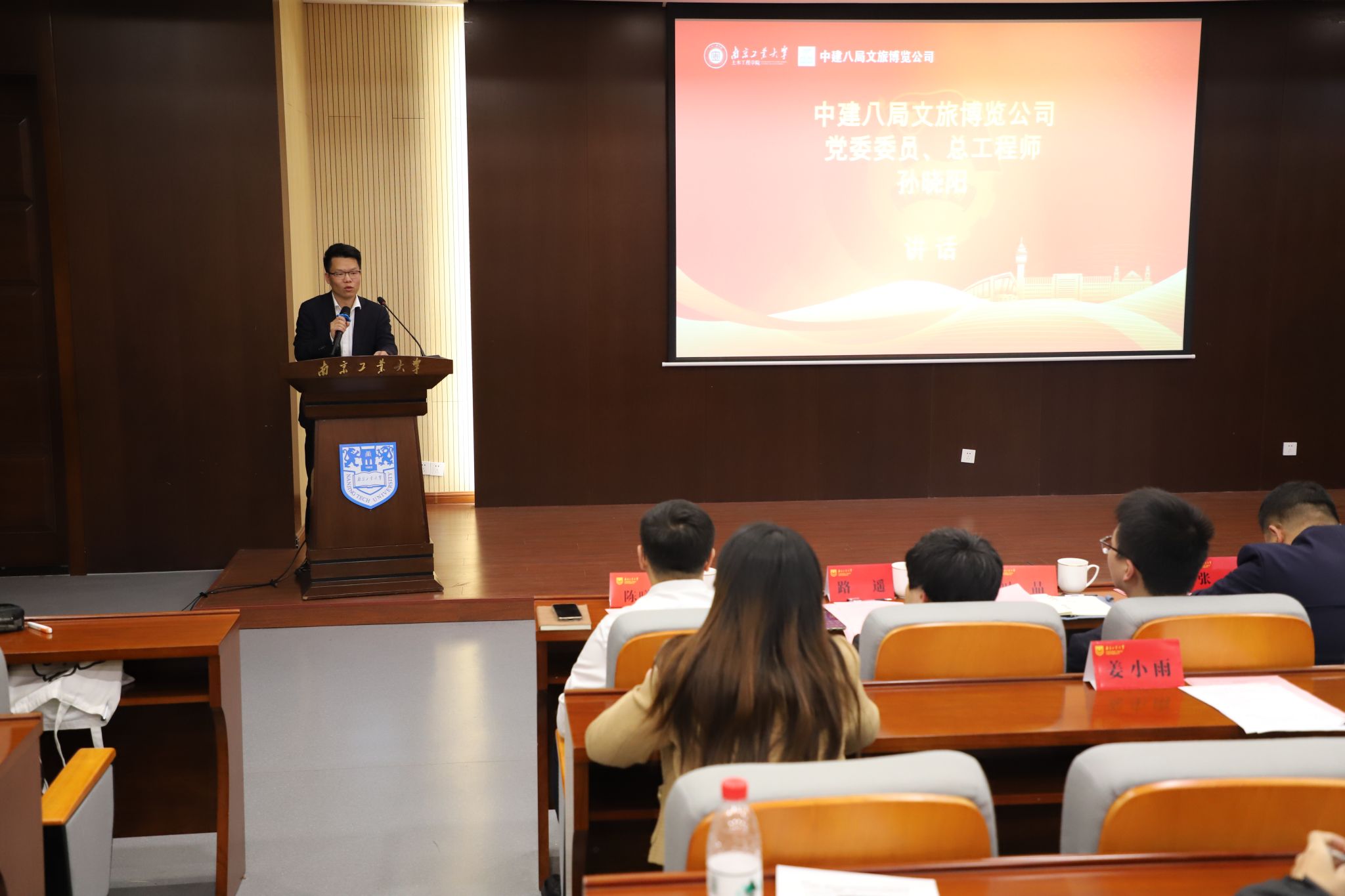 张涛书记对中建八局文旅博览公司的到来表示热烈欢迎,希望通过“思政引领+校企合作”的方式,进一步发挥产教融合品牌特色。王郁超书记在讲话中充分肯定了产教融合的育人模式,希望公司团员青年通过此次活动,相互学习、增进交流、内化于心、外化于行。