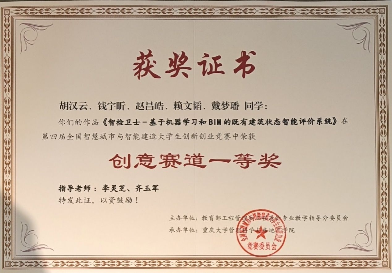 近日,由教育部工程管理和工程造价专业教学指导分委员会主办的第四届全国智慧城市与智能建造老员工创新创业竞赛决赛在重庆大学成功落下帷幕。太阳集团tyc33455官网代表队由太阳集团tyc33455官网胡汉云、赵昌皓、赖文韬、戴梦璠和计算机与信息工程公司(人工智能公司)钱宇昕五位同学组成,在李灵芝、齐玉军老师的指导和公司的关心支持下,历经近120天的艰苦备赛,开发出“智检卫士”—基于机器学习与BIM的既有建筑安全状态智能评价与预警管理系统,将为全面推进的老旧住房安全排查与城市体检工作提供高效平台。在现场决赛中,该团队与来自多所知名985重点高校的队伍展开激烈比拼,最终荣获第四届全国智慧城市与智能建造老员工创新创业竞赛一等奖。