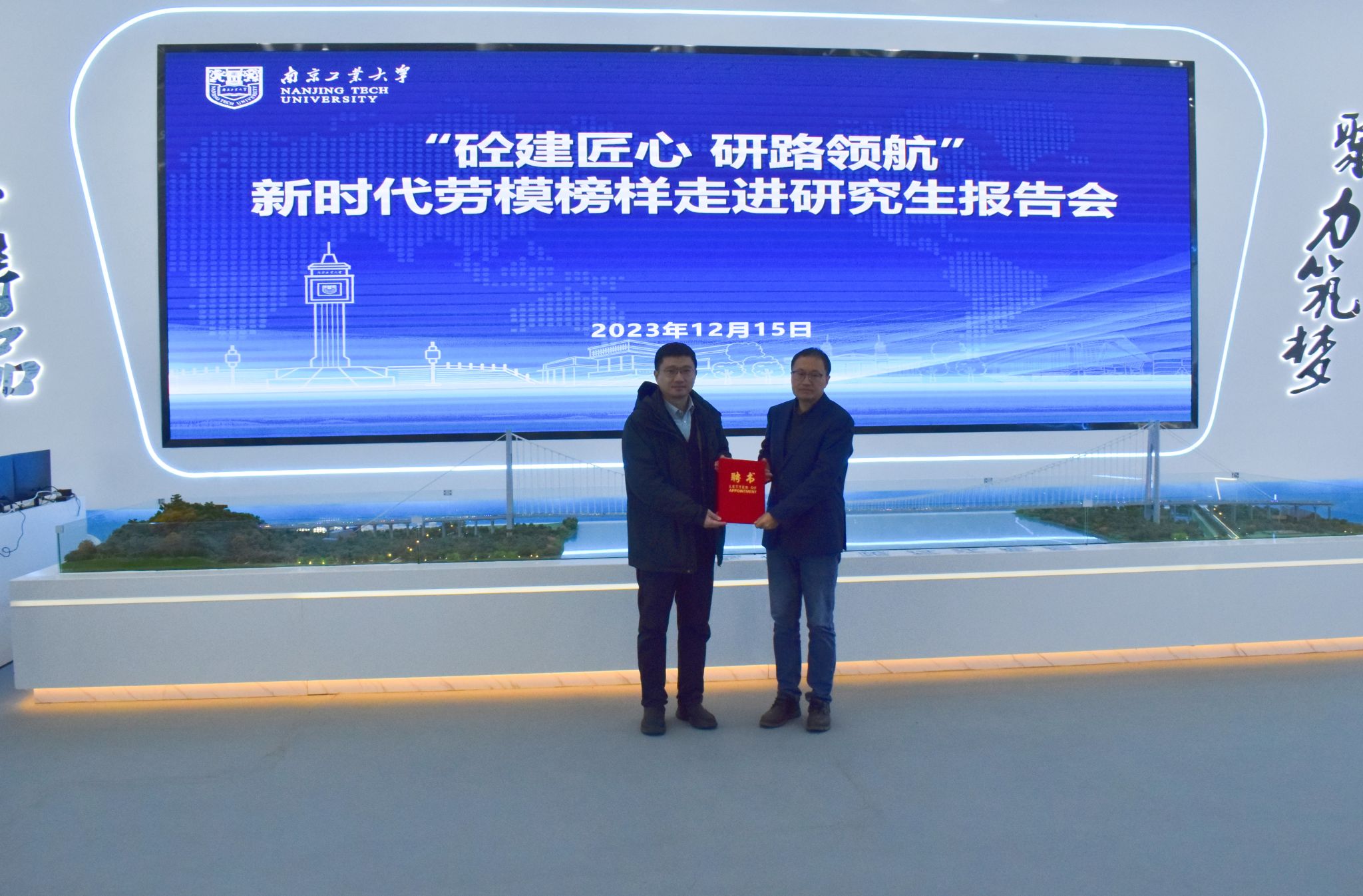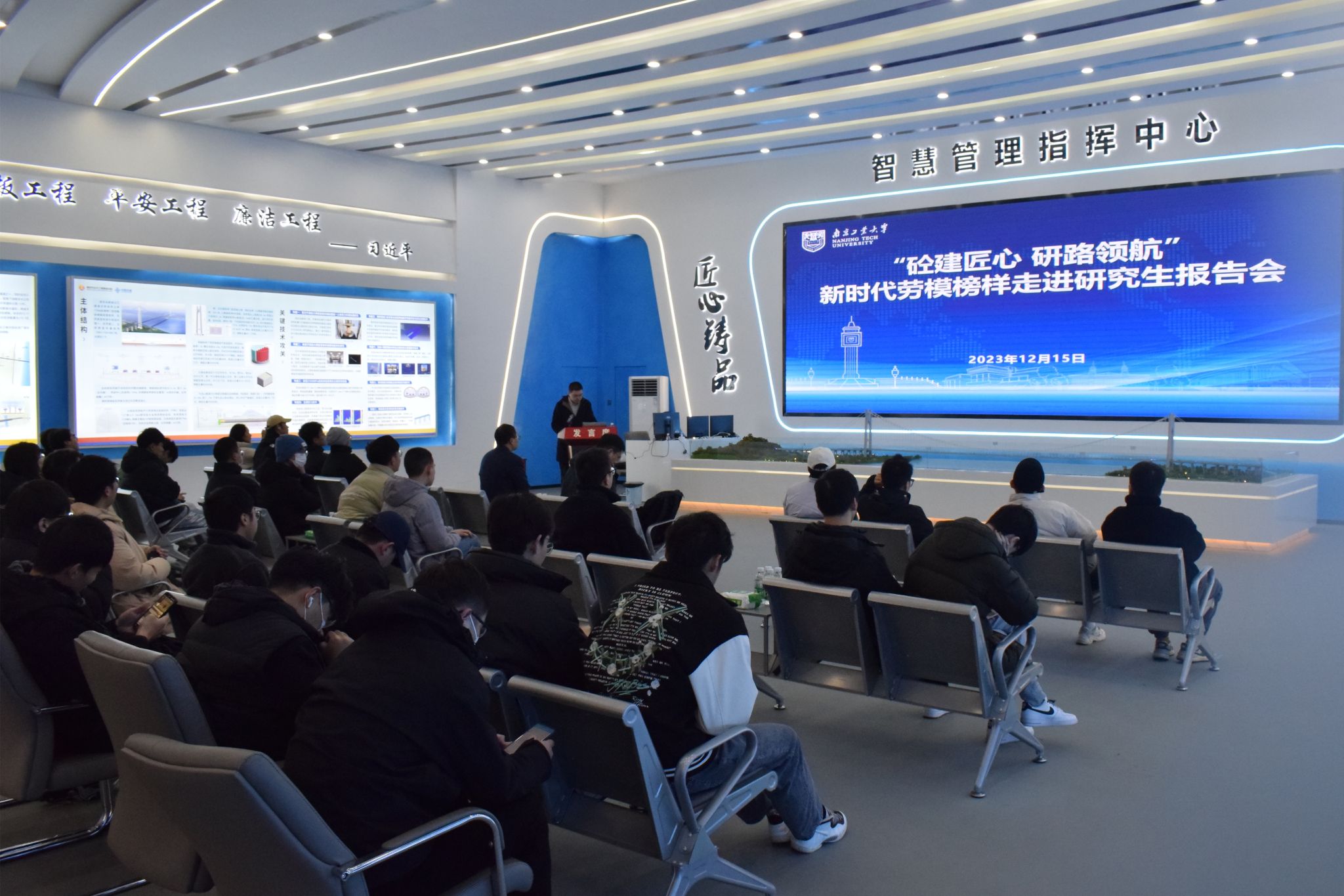 12月15日上午,太阳集团tyc33455官网组织师生赴南京仙新路长江大桥项目开展“砼建匠心 研路领航”新时代劳模榜样走进研究生报告会。全国先进工作者、江苏交通工匠、南京市劳动模范、南京市公共工程建设中心质量安全处处长、正高级工程师沈斌,太阳集团tyc33455官网副经理陈鑫、研究生代表出席报告会。