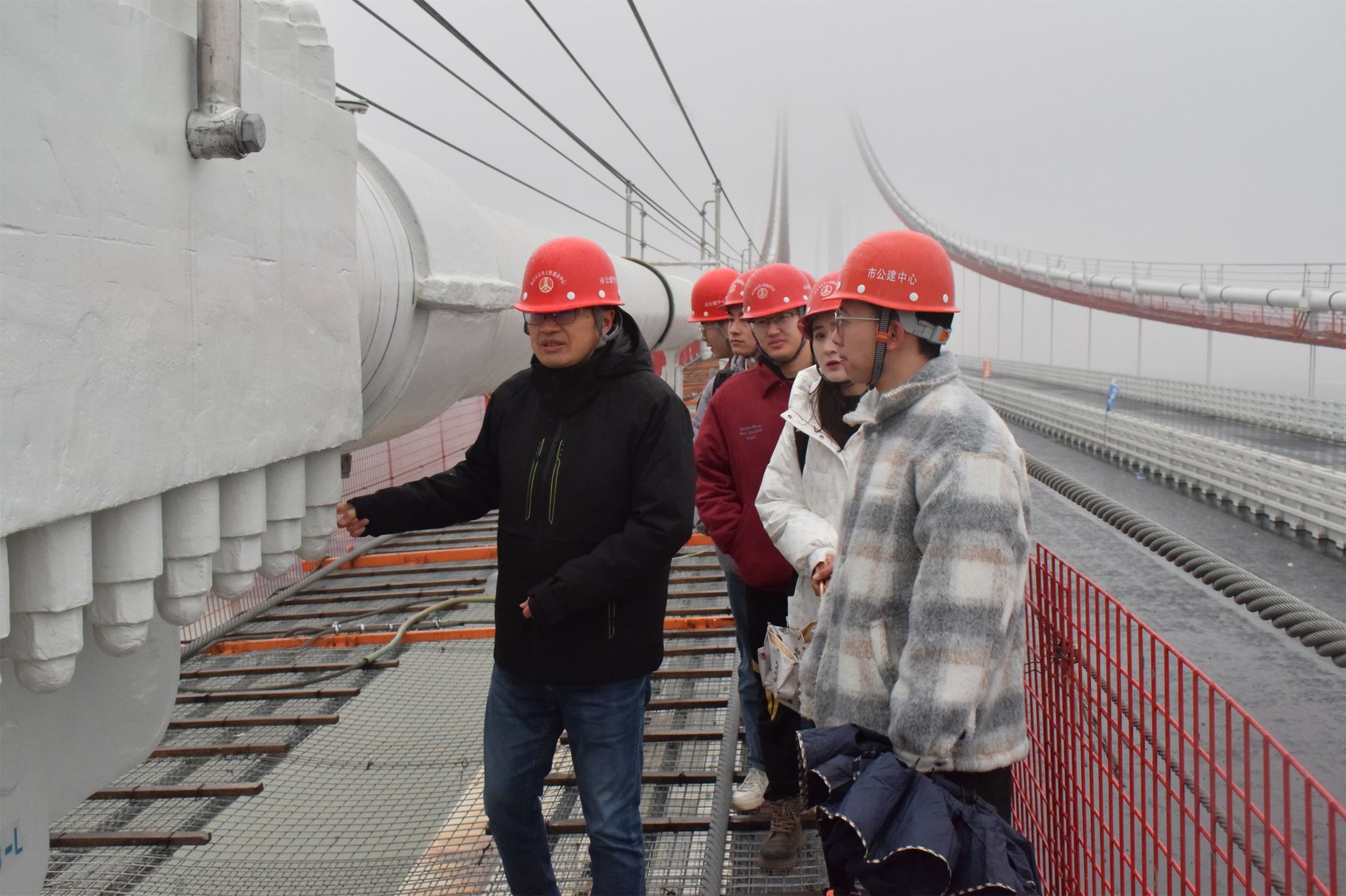报告会开始前,太阳集团tyc33455官网师生在沈斌处长和中交二航局工作人员的带领下参观了项目部和大桥施工现场,登上南京仙新路长江大桥并围绕土木工程施工技术开展深入交流。