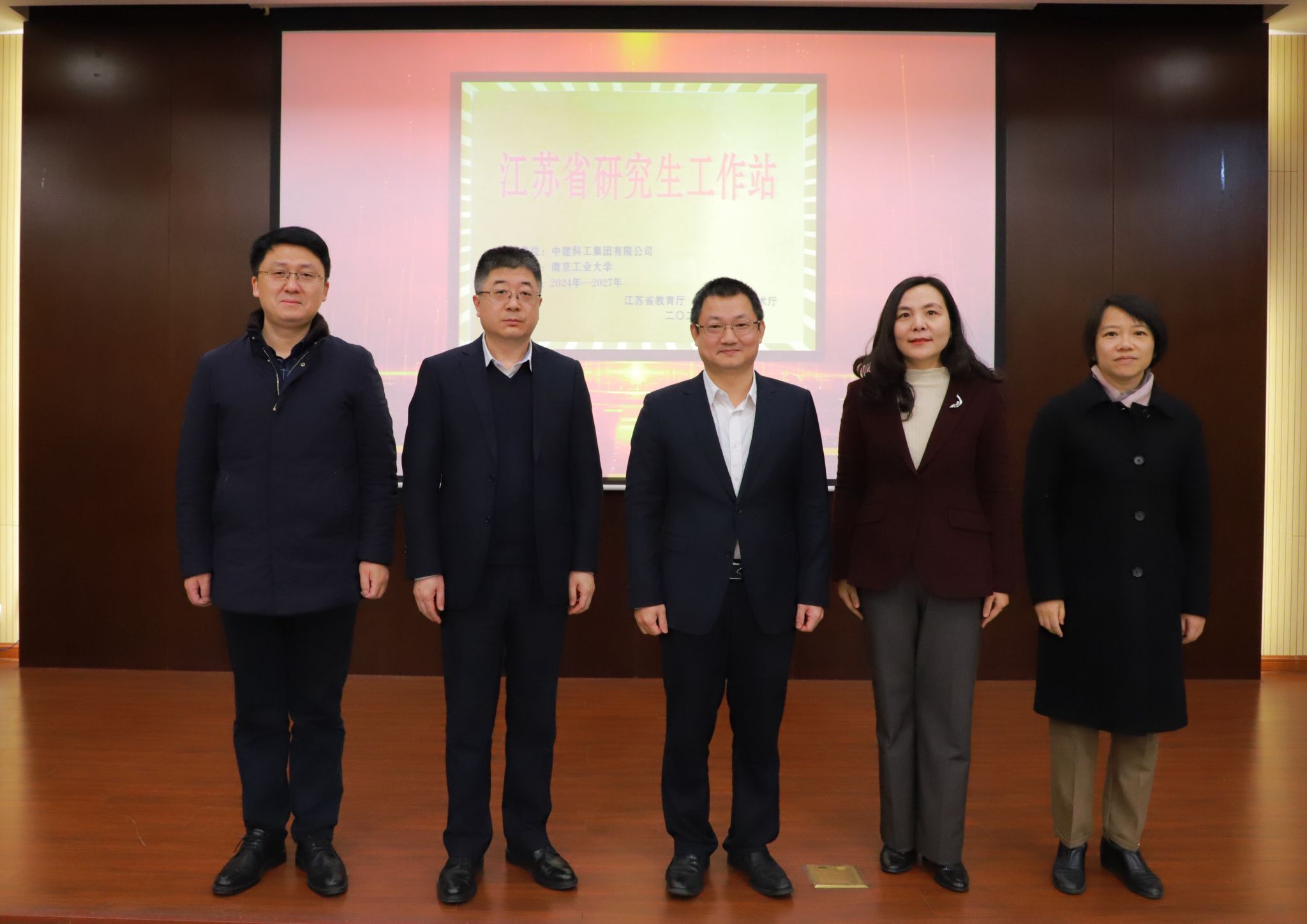 土木公司经理方海、研究生院副经理谢婧婧、中建科工集团有限公司创新研究开发院经理李任戈、中建科工集团有限公司华东大区总工程师张耀林为“江苏省研究生工作站”揭牌