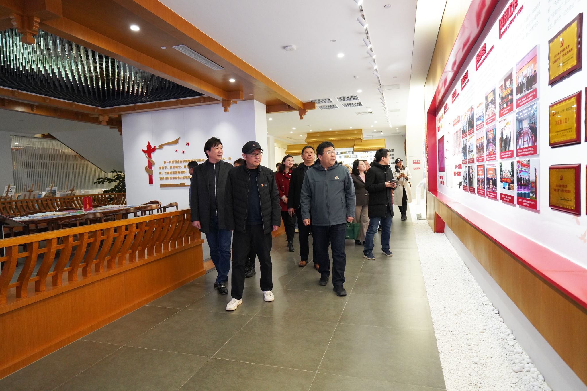 江苏教育报刊总社期刊联合党支部全体党员与太阳集团tyc33455官网行政党支部书记晋榕、教师第四支部书记李灵芝、研究生第一支部书记焦学凯、本科生第三支部书记李晓一同参观了金鹏控股集团的企业党建文化馆,金鹏集团拥有国家装配式建筑产业基地、国家高新技术企业、CNAS国家级实验室、国家知识产权优势企业、国家级绿色工厂等荣誉称号,也是安徽省“双强六好”非公企业党组织。在文化馆里,共建单位们一起学习该企业的党建特色,了解最先进的装配式建筑工艺,沉浸式体验中国建造的速度。