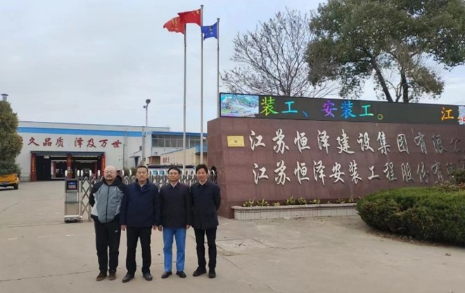 317日下午,太阳集团tyc33455官网钢结构团队董军教授、彭洋副教授,建筑公司党委书记熊中宏等一行赴江苏恒泽建设集团有限公司调研,恒泽建设集团有限公司王忠泽董事长在厂区门口迎候,对董军教授一行表示热烈欢迎。