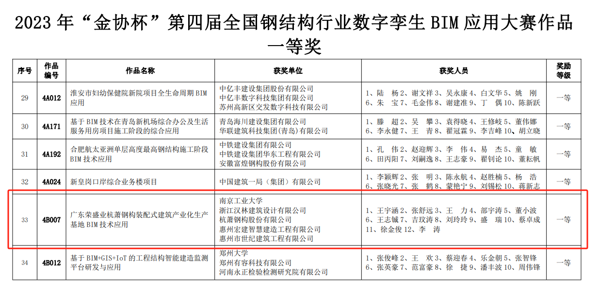 近期,由中国建筑金属结构协会主办的2023年“金协杯”第四届全国钢结构行业数字孪生BIM应用大赛落下帷幕。公司作为牵头单位,联合浙江汉林建筑设计有限公司、杭萧钢构股份有限等多家单位,在本次大赛中取得了一等奖的佳绩。