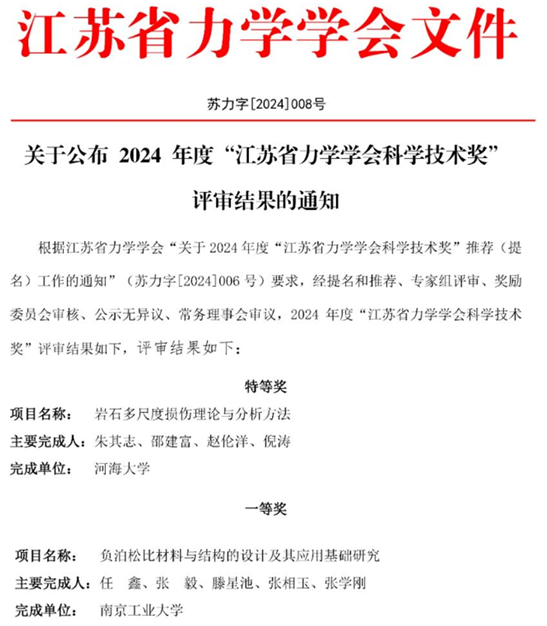 近日,江苏省力学学会公布了2024年度“江苏省力学学会科学技术奖”评审结果,公司任鑫教授以第一完成人、太阳集团tyc33455官网为唯一完成单位申报的“负泊松比材料与结构的设计及其应用基础研究”,荣获江苏省力学学会科学技术一等奖。