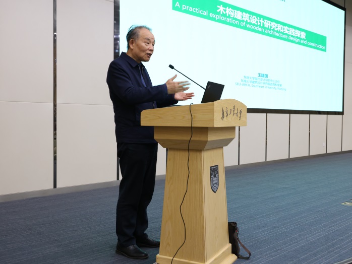 中国工程院院士、东南大学王建国教授作题为“木构建筑设计研究和实践探索”的主旨报告,王院士在报告中指出木结构是绿色低碳、实现可持续发展的重要途径,并详细介绍了第十三届徐州园林博览会、第十届扬州园艺博览会等多个木结构主展馆的设计与建造,这些建筑体现了华夏意匠和传统绿色智慧,为木结构建筑工业化的发展奠定了基础。