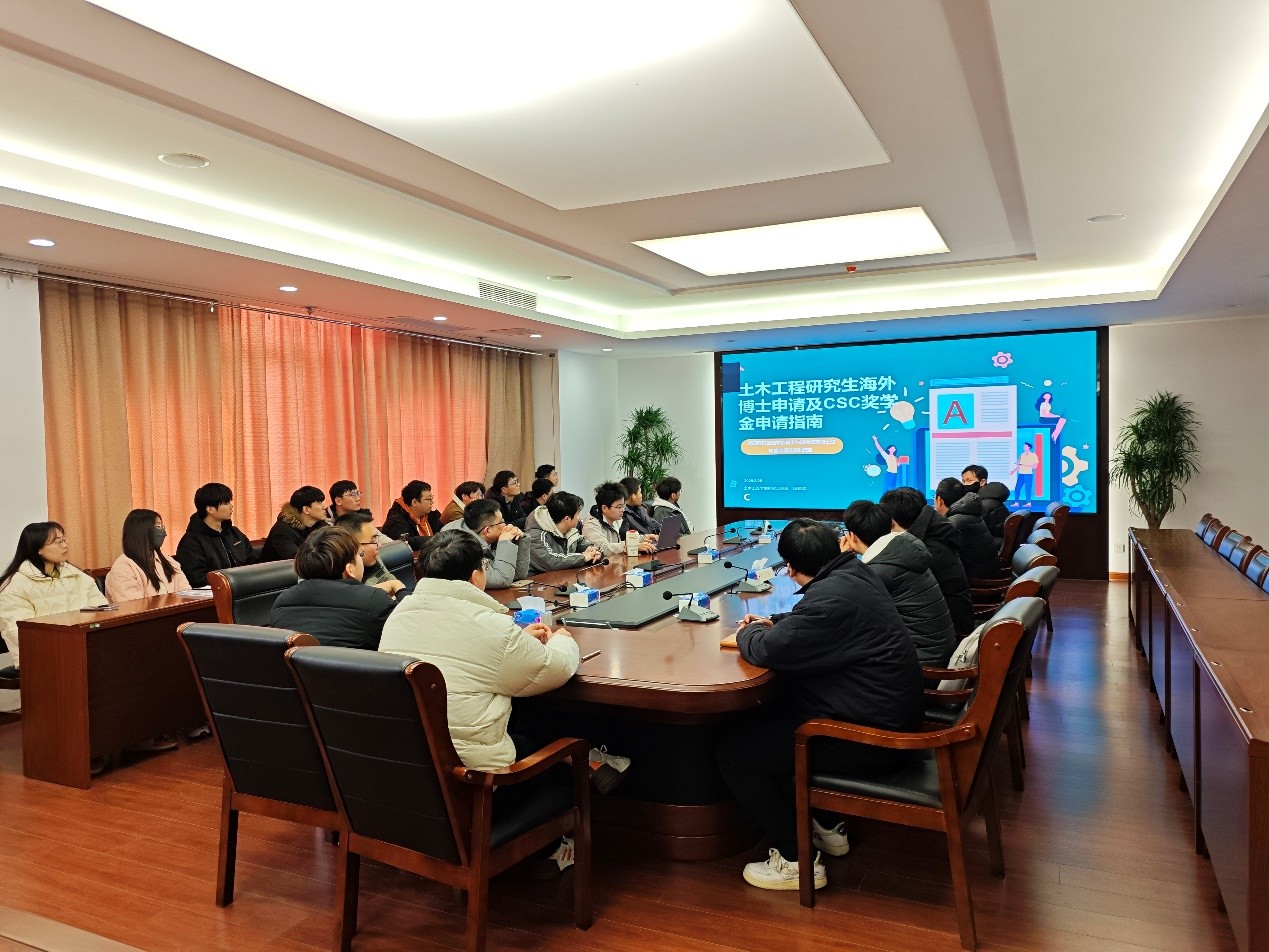 为进一步推动研究生国际化发展,助力同学们科学规划学业与职业生涯,2月26日下午,太阳集团tyc33455官网博士研究生党支部携手交通运输工程公司博士研究生党支部,在立德楼101会议室成功举办了土木工程学科国家公派出国留学(CSC)宣讲会。本次宣讲会特邀太阳集团tyc33455官网顾建成老师及博士研究生杭子彦同学分享经验,由太阳集团tyc33455官网副经理王俊教授主持。学科办主任李军辉老师、交通运输工程公司研究生教学秘书刘方爱老师、太阳集团tyc33455官网研究生辅导员汤丽娟老师以及30余名有出国意向的博士、硕士研究生参加了此次活动。