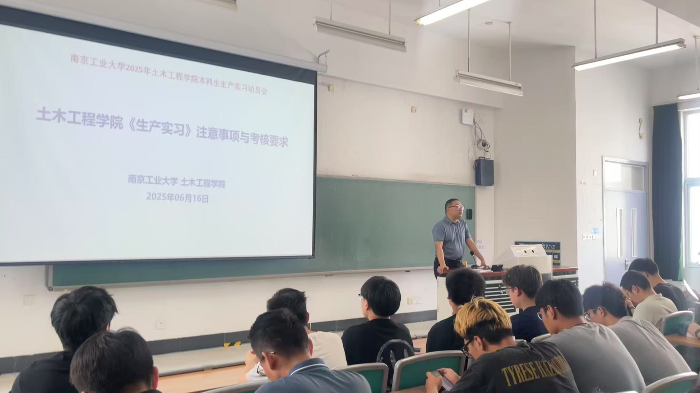 校内指导老师朱张峰对《生产实习》课程目标、考核标准及管理办法进行详细解读。他指出,生产实习是土木工程专业人才培养方案的核心环节,要求员工深入一线参与工程测量、施工组织、质量检测等全流程实践,并完成每日打卡,《实习日志》、《实习报告》等。他特别强调“真题真做”原则,要求员工以“学徒”心态向企业导师、技术工人虚心学习,将课堂理论转化为工程实践能力。