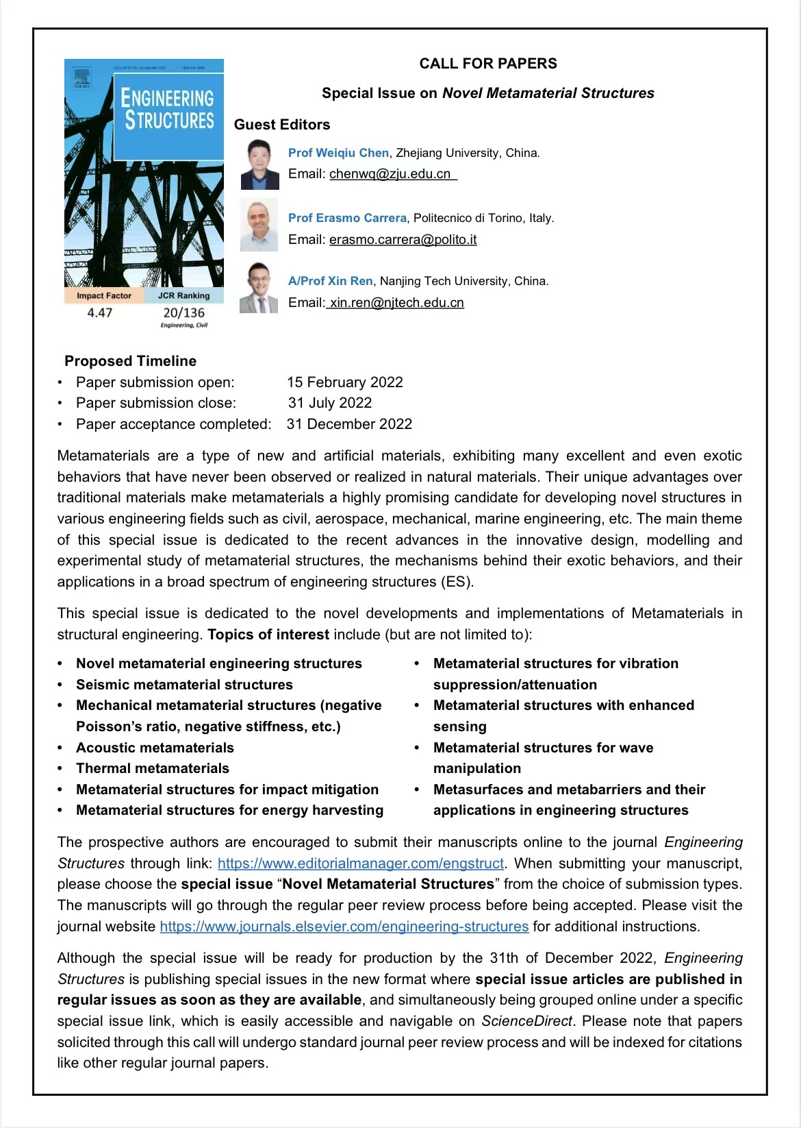鉴于公司任鑫副教授在力学超材料(Mechanical Metamaterials)领域所做出的突出贡献及其学术影响力,近日,任鑫副教授被爱思唯尔(Elsevier)出版社正式任命为“Novel Metamaterial Structures”专刊的客座主编,负责主持该专刊的宣传、邀稿以及分发的工作。该专刊所有被收录的论文将在Engineering Structures期刊上发表。爱思唯尔(Elsevier)出版社设立“Novel Metamaterial Structures”的专刊,意味着这一研究领域已经成为学术界热门的研究领域。公司老师能受邀担任结构工程领域国际TOP期刊“新型超材料结构”专刊的客座主编,标志着公司在该领域的研究工作已经得到了国际学术界的广泛认可,研究水平在该细分领域已经走在了国际前列。