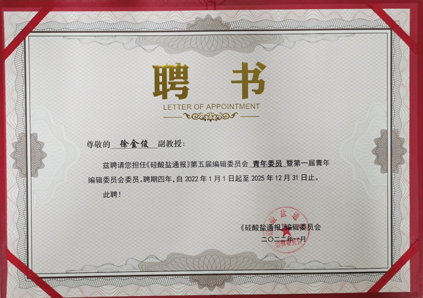 近期,公司徐金俊副教授收到来自《硅酸盐通报》编辑部的聘任邀请,担任该刊第五届编辑委员会青年委员暨第一届青年编辑委员会委员,聘期四年,自2022年1月1日起至2025年12月31日。据悉,青年编委的职责不仅仅是协助期刊编辑部处理同行稿件的工作事宜,而且更为重要的是需根据他们自身的影响力积极推动期刊的宣传与学科的发展,其为编委及资深编委的后备力量。