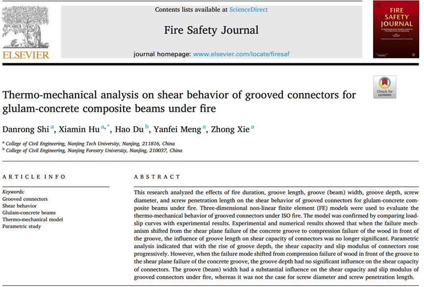 太阳集团tyc33455官网胡夏闽教授团队在火灾安全领域权威刊物《Fire Safety Journal》上发表题为“Thermo-mechanical analysis on shear behavior of grooved connectors for glulam-concrete composite beams under fire”的研究论文。2019级硕士生施丹蓉为该论文的第一作者,胡夏闽为通讯作者。