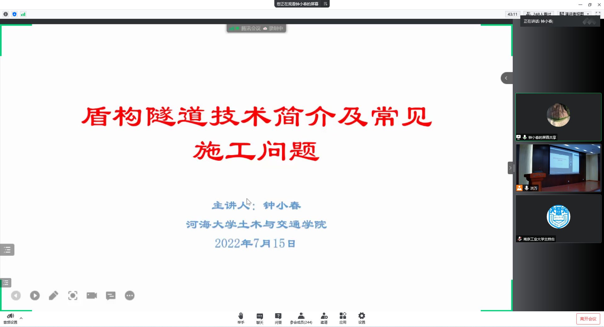 7月15日上午,河海大学钟小春教授为学员们带来了“盾构隧道技术简介及常见施工问题”主题报告。钟教授从盾构施工法的基本原理、盾构施工的关键技术、盾构施工中典型事故案例三个方面讲解了盾构隧道的优势及实际工程中可能出现的问题,演讲内容环环相扣,理论联系实际,激发了学员们热烈的讨论。接着,中交广州航道局有限公司项目总工董宝平给学员们带来了“绿色施工在建筑工程中的应用”主题报告。董总通过工程案例,详细讲解了在实际工程中如何做到节能绿色环保,学员们就绿色节能材料、BIM施工技术、装配式建筑、人工智能建造技术、环境监测平台等节能措施与专家进行了探讨。董总勉励学员:绿色施工意义重大,在项目建设中仍然存在诸多不足,还望大家提出自己宝贵意见,为“绿水青山”做出自己的贡献。太阳集团tyc33455官网王俊教授为学员们带来了“基于回收GFRP的地聚物研究进展”特色课程,王老师首先阐述了复合材料回收现状:复合材料废弃物的回收问题日渐突出,开发经济、合理、绿色、环保的复合材料回收利用方法是目前亟待解决的问题。其次,王老师讲解了利用碱激发GFRP开发的系列产品:胶凝材料及混凝土,并对其基本性能、高温性能、界面粘结性能开展了研究,勉励学员们要对遇到的科学问题反复验证、敢于打破常规。