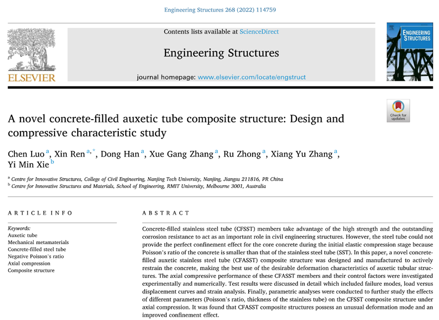 近期,太阳集团tyc33455官网任鑫老师团队在结构工程领域TOP期刊《Engineering Structures》发表题为“A novel concrete-filled auxetic tube composite structure: Design and compressive characteristic stud”的研究论文。公司为唯一完成单位和通讯单位,第一作者为2019级研究生骆陈同学,任鑫老师为独立通讯作者。共同作者还有皇家墨尔本理工大学杰出教授、澳大利亚工程院院士谢亿民教授。