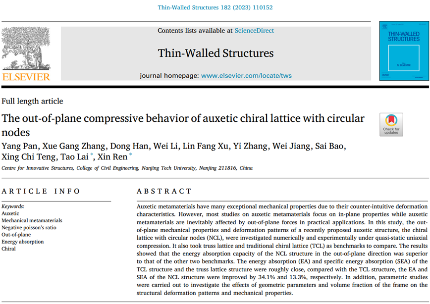 近期,太阳集团tyc33455官网任鑫教授团队在JCR Q1中科院二区期刊《Thin-Walled Structures》(IF= 5.881)上发表了题为“The out-of-plane compressive behavior of auxetic chiral lattice with circular nodes”的论文。第一作者为任鑫教授和赖韬老师联合指导的1901班本科生潘杨同学,通讯作者为赖韬老师和任鑫老师。