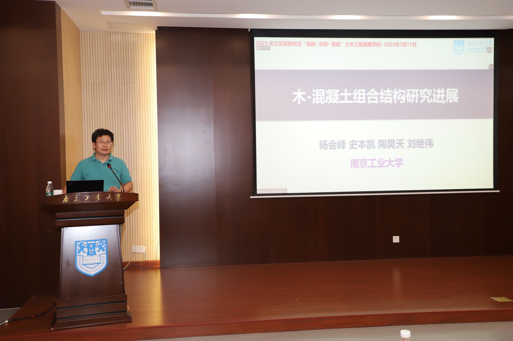 杨会峰教授以《木-混凝土组合结构研究进展》为题,详细介绍了木结构发展背景,给学员们科普了木结构的相关知识包括材料性能、结构性能、抗震耐火美观等优势。随后,讲解了木-混凝土界面受力性能、木-混凝土组合梁受力性能、木-混凝土组合节点受力性能等。杨会峰教授最后以研究团队承担过的诸多实际工程项目给学员们生动地解释了木结构的发展应用情况。报告内容广博丰富,拓宽了学员的知识视野。