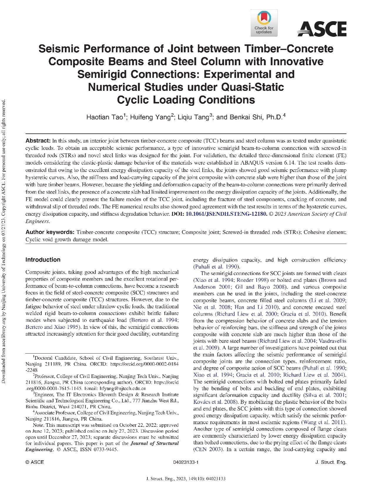 木结构团队杨会峰教授以通讯作者在ASCE旗下期刊《Journal of Structural Engineering》发表题为“Seismic Performance of Joint between Timber–Concrete Composite Beams and Steel Column with Innovative Semirigid Connections: Experimental and Numerical Studies under Quasi-Static Cyclic Loading Conditions”研究论文,论文的第一作者为东南大学陶昊天博士。