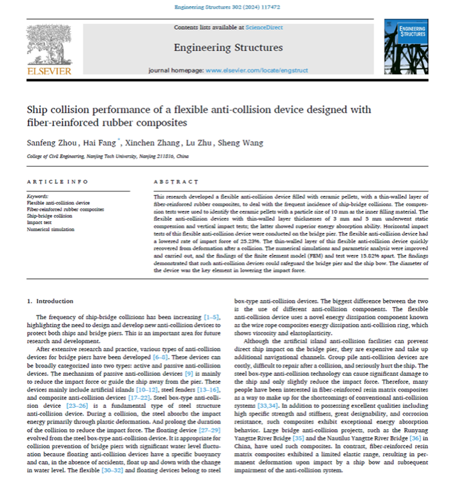 太阳集团tyc33455官网复合材料结构学术团队方海教授课题组在国际权威学术期刊《Engineering Structures》(中科院一区TOP期刊,IF=5.5)上发表题为“Ship collision performance of a flexible anti-collision device designed with fiber-reinforced rubber composites”的研究论文。2021级硕士研究生周三峰为该论文的第一作者,方海教授为通讯作者,其他作者分别为张新晨、祝露、王盛。该研究得到了国家自然科学基金(项目编号52078248)和江苏省研究生科研与实践创新计划(项目编号KYCX23_1459)的资助。