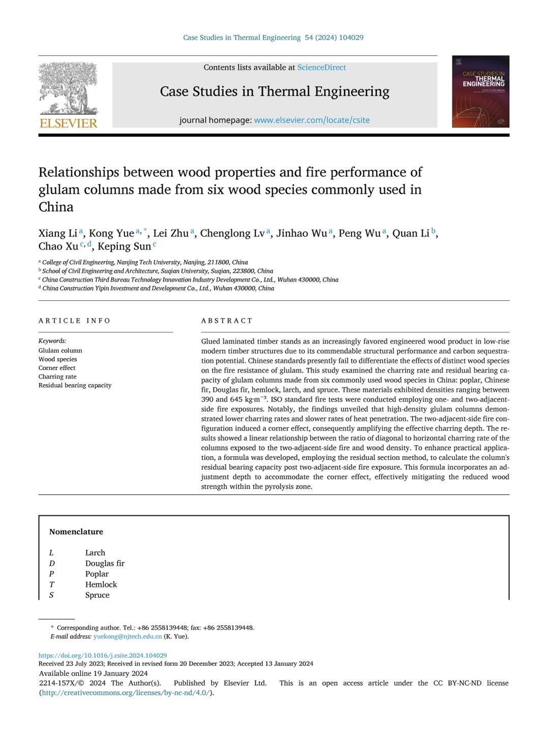 太阳集团tyc33455官网木结构学术团队岳孔教授课题组在国际权威学术期刊《Case Studies in Thermal Engineering》(中科院大类学科:工程技术2区,小类学科:热力学2区,TOP期刊,IF=6.8)上发表题为“Relationships between wood properties and fire performance of glulam columns made from six wood species commonly used in China”的研究论文。公司2022级硕士生李响为该论文的第一作者,岳孔教授为通讯作者,其他作者分别为2023级硕士生朱磊、2020级博士生吕城龙、2018级硕士生吴金浩、吴鹏副教授,以及合作单位的李权、徐超和孙克平。该研究得到了国家自然科学基金项目(项目编号:51978331和52108220)与江苏省农业科技自主创新资金项目(项目编号:CX(22)3055)的资助。
