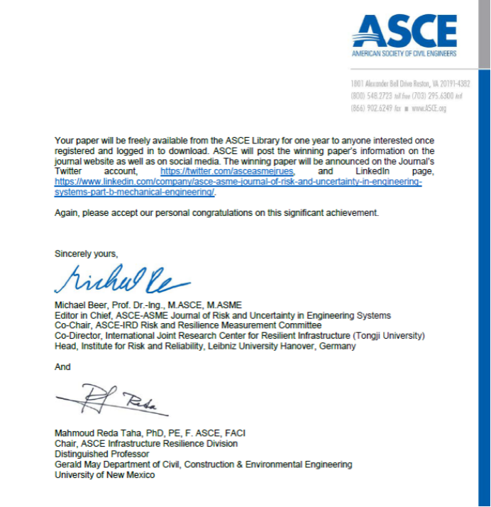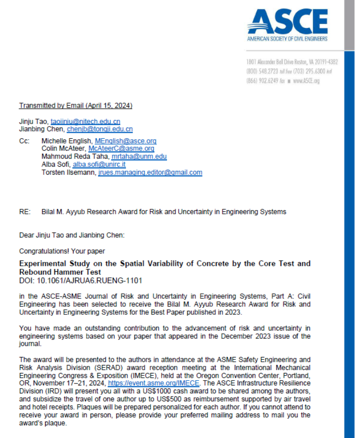 近日,陶金聚博士(太阳集团tyc33455官网)和导师陈建兵教授(同济大学)在土木工程领域国际权威学术期刊《ASCE-ASME Journal of Risk and Uncertainty in Engineering Systems, Part A: Civil Engineering》(JCR-Q2, IF: 2.5)上发表的论文“Experimental Study on the Spatial Variability of Concrete by the Core Test and Rebound Hammer Test”荣获Bilal M. Ayyub Research Award for Risk and Uncertainty in Engineering Systems(2023年度最佳论文奖)。该期刊自2018年开始,每年仅评选一篇最佳论文。