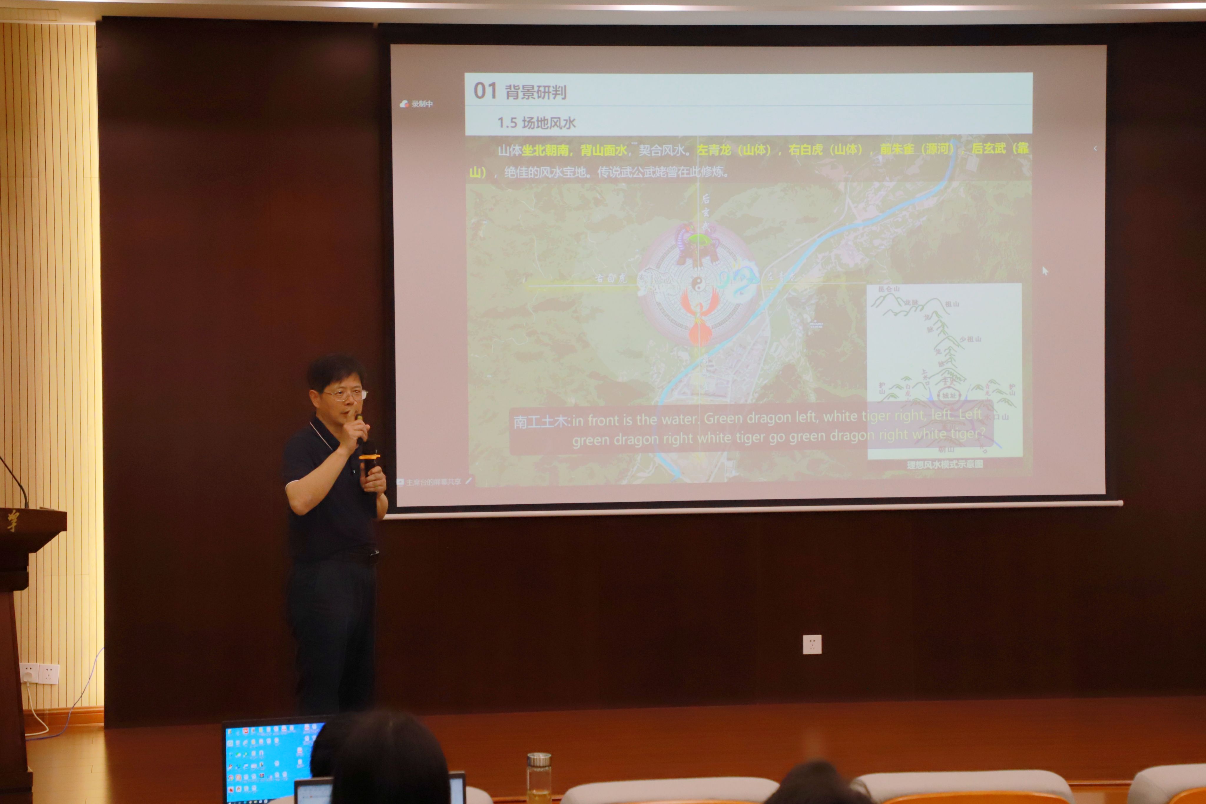 庄勇教授的带来的报告是《武功山·天心妙境》,报告从项目场地的风水出发,详细介绍了景区的规划衔接。分析了武功山景区的发展定位,建立集“文化沉浸、情景体验、修心养性、美食餐饮、酒店服务”等多功能于一体的文化博览园,景区规划总体布局与陆王心学息息相关,天然之心与人文之心合成一环,寓意天人合一。庄勇教授对景区每个分区的寓意、规划思路进行了详细阐述,报告内容紧扣中国传统文化,强调让山水与心灵对话,文化与自然融合,化出如诗如画的意境,需要我们灵性感悟,创新达意,化平凡为神奇。庄勇教授的报告讲述了一场关于人与自然和谐共生的美学实践,让学员们在领略山水之美中,感悟文化之深,整场报告生动有趣,充分调动了学员们的积极性。